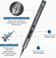 【Small and Powerful】This mini power screwdriver has a rotate speed of 200r/min, automatic/manual mode with 0.25-0.35/3N.m, powered by 350mAh rechargeable lithium battery, 30~40 mins charging time, and works continuously for 2-3 hours which has total power enough for your electronic repair work.