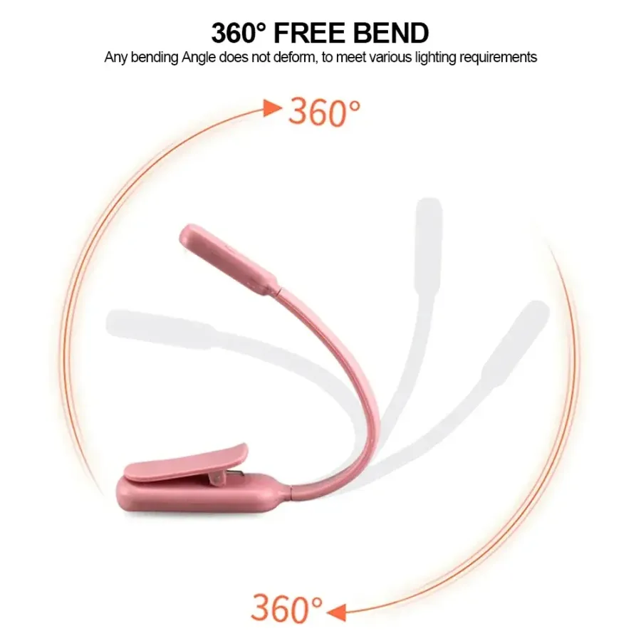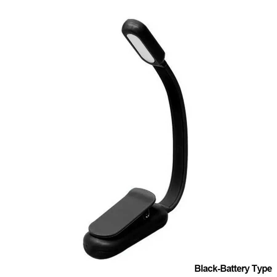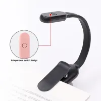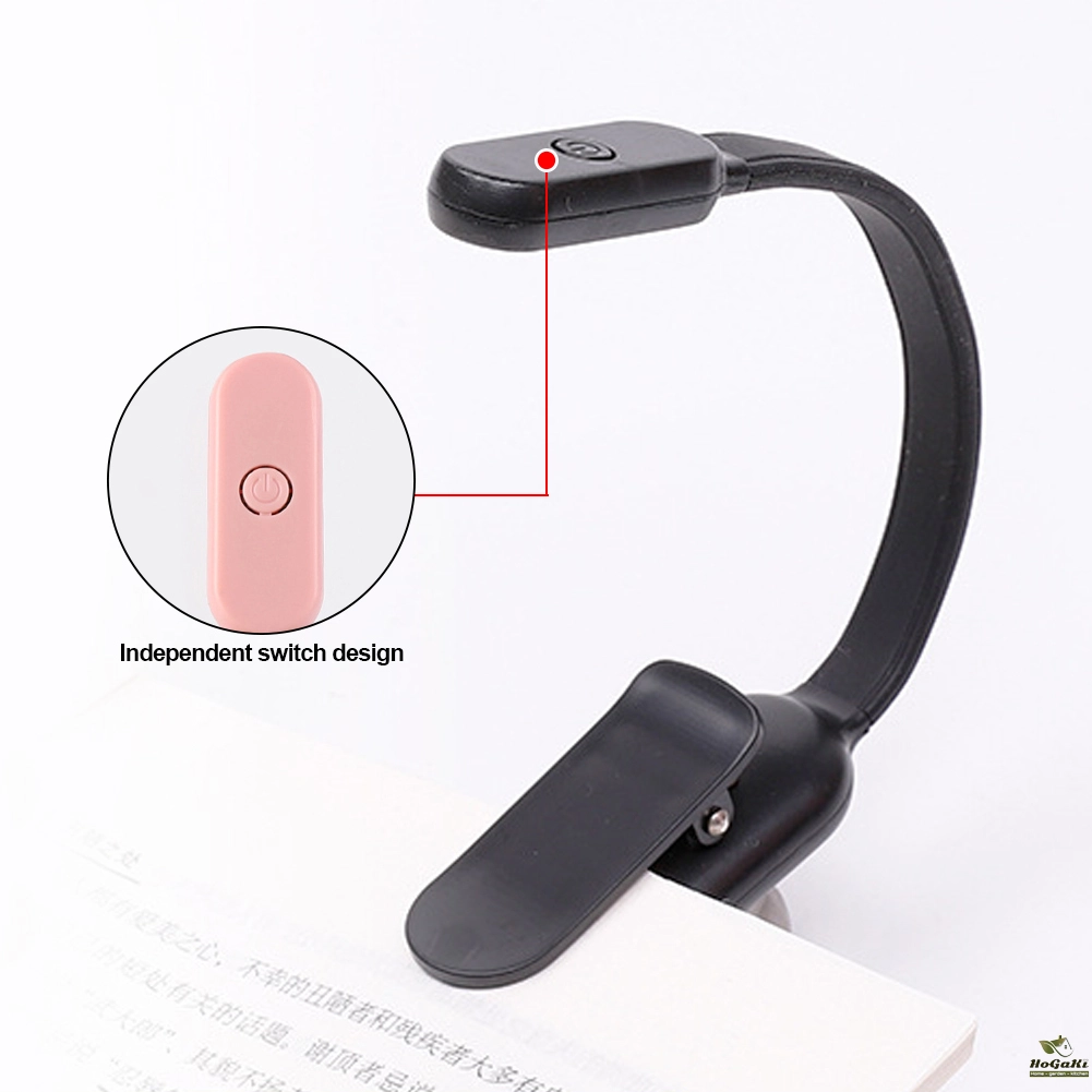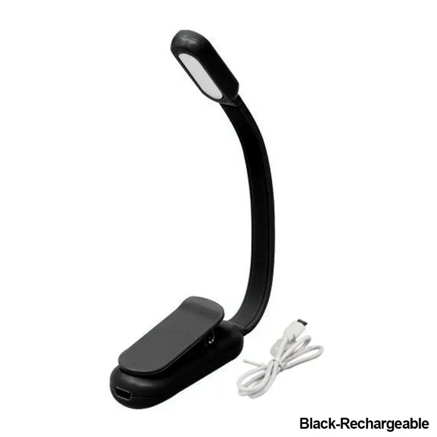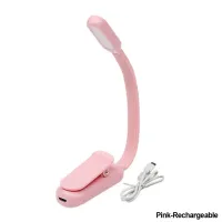 Battery or USB rechargeable mini LED reading lamp, can stand on desk or clip on book.
