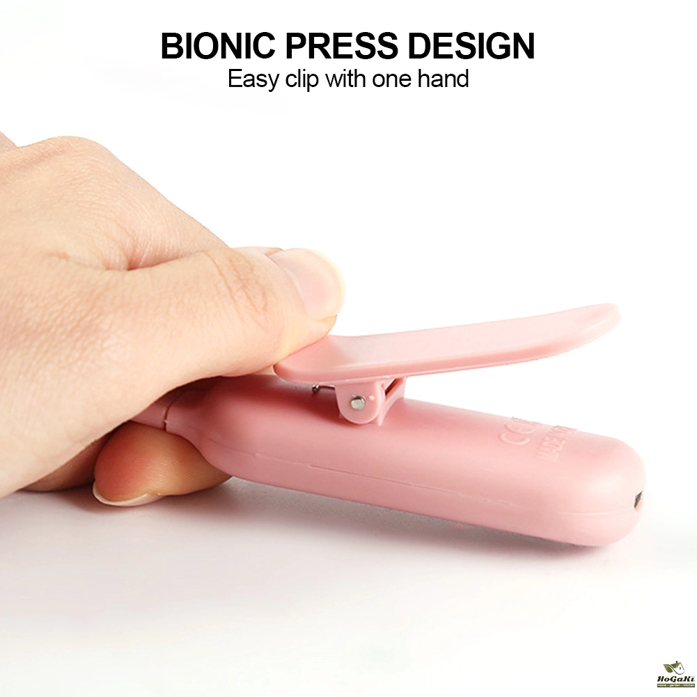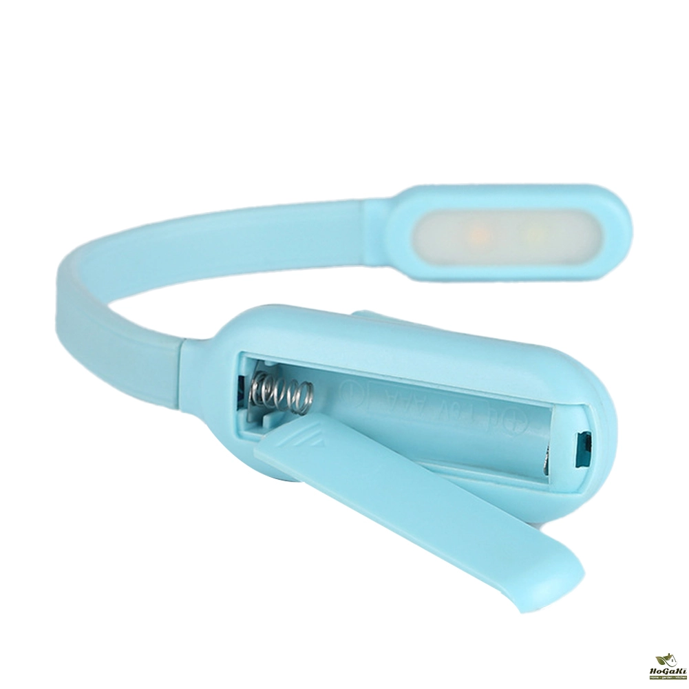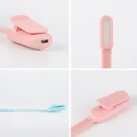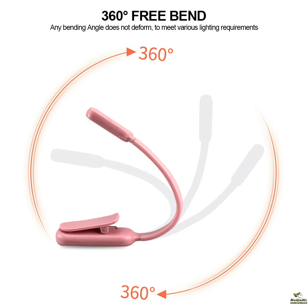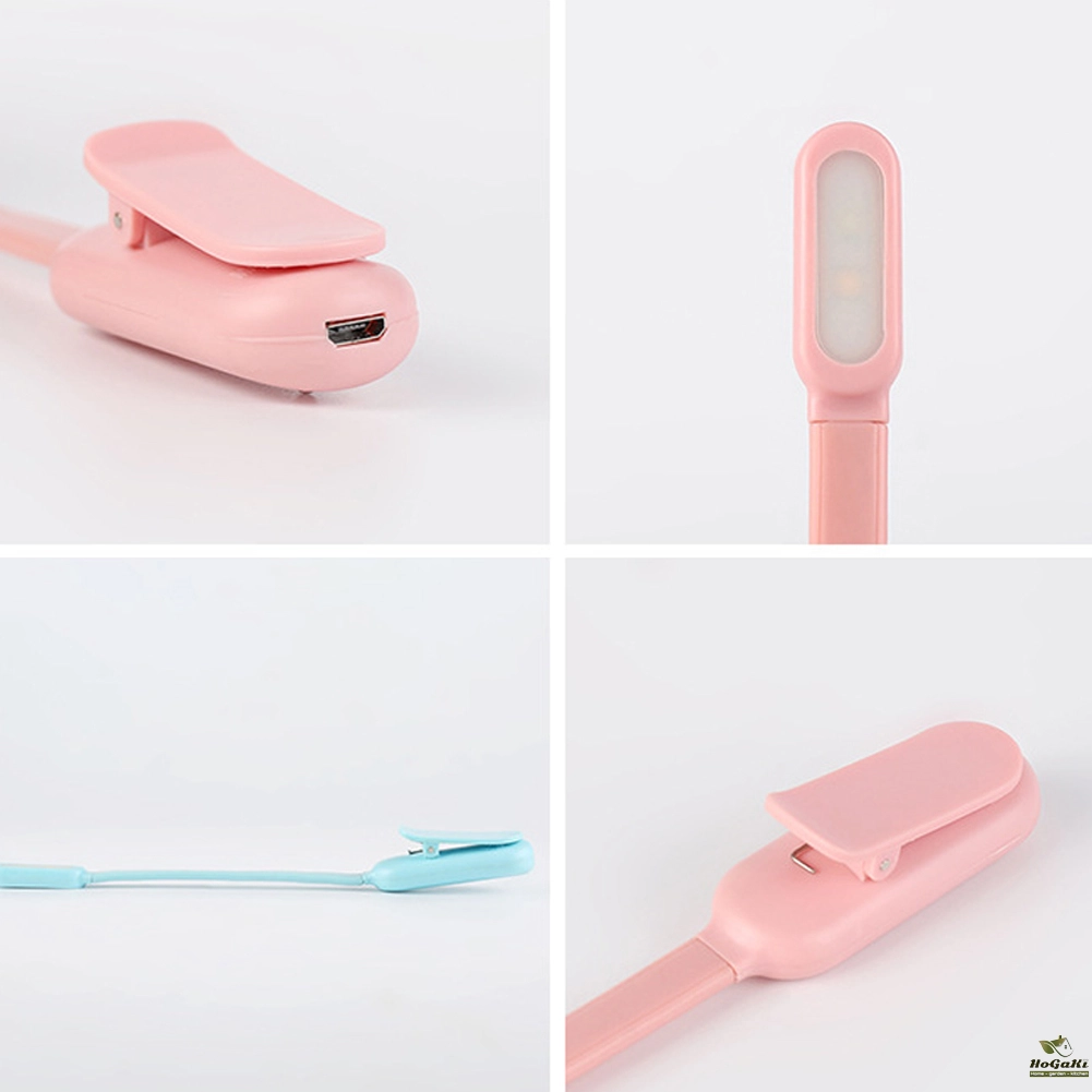 Battery or USB rechargeable mini LED reading lamp, can stand on desk or clip on book.