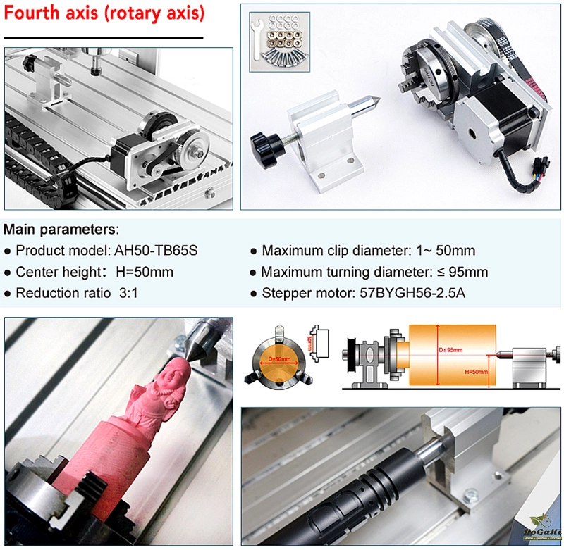Center height: H = 50mm Maximum turning diameter: ≤95mm Deceleration ratio: 3:1 Stepper motor: NEMA23-2.5A Weight: 4.2KG |