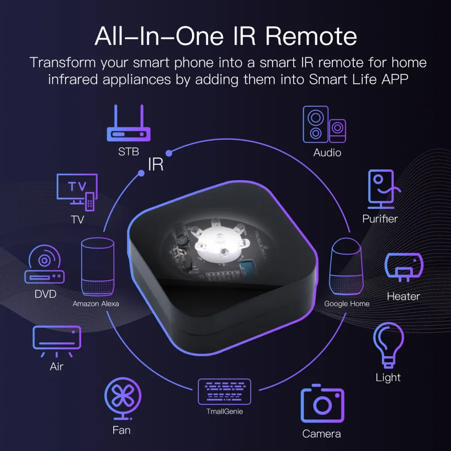 2.All-in One Control by Smart Phones:All-in-one IR remote control devotes to activating house infrared appliances as Air conditioners, TVs, fans, DVDs, STBs, TV BOXes etc with one single MOES SMART IR (Only support Ir (38KHZ ) ,RF not included),adding all compatible devices into the remote for wireless remote control by smart phones anywhere you like;Control your appliances in advance when you are away from home.