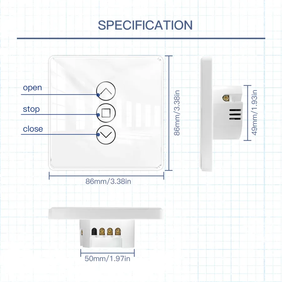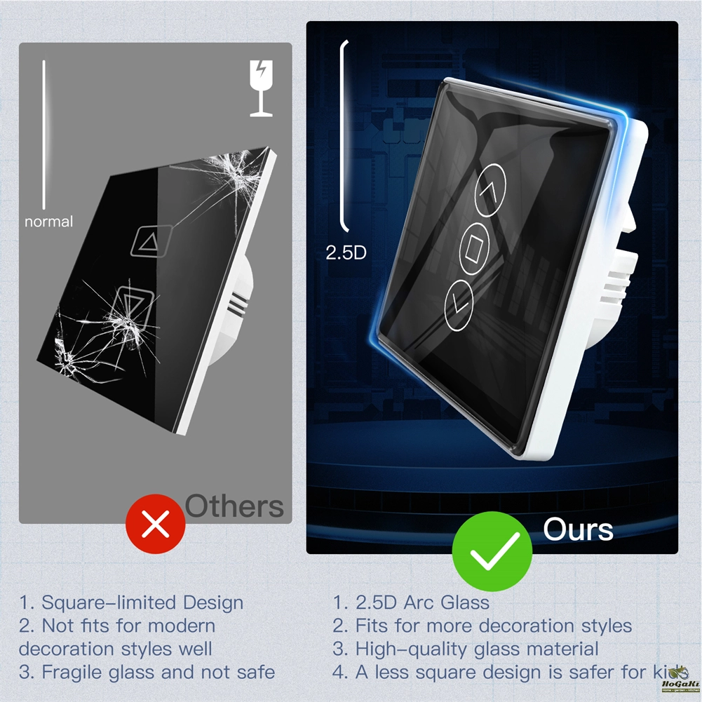 1.New upgraded 2.5D arc glass touch panel design fits well for more decoration styles,breaking traditional square-limited design style,which looks more textured and aesthetic;High-quality glass material makes it more valuable and worth buying;A really deserving new smart home tech to replace your traditional house curtain switches with Tuya technology built in.