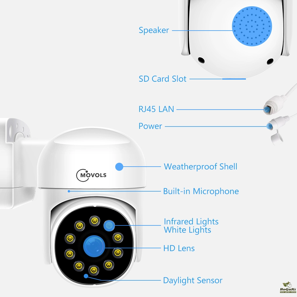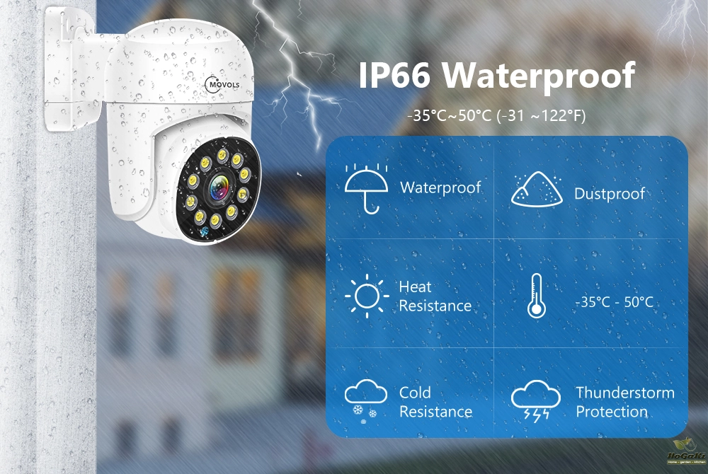 MOVOLS surveillance camera has a solid body and housing,with an IP66 waterproof rating. So you can feel free to install it outdoor, like in your garage, backyard, or anywhere else. It can stand harsh weather conditions, including rain, snow, intense cold and heat(-35℃~50℃).