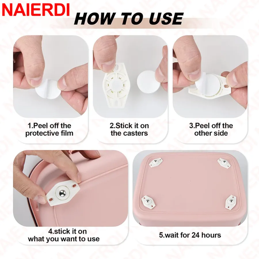 【Easy Installation in One Minute】Forget about the hassle of drilling and complicated installation steps. NAIERDI self adhesive mini caster wheels simply require peeling off the backing film and pressing them onto any smooth surface.