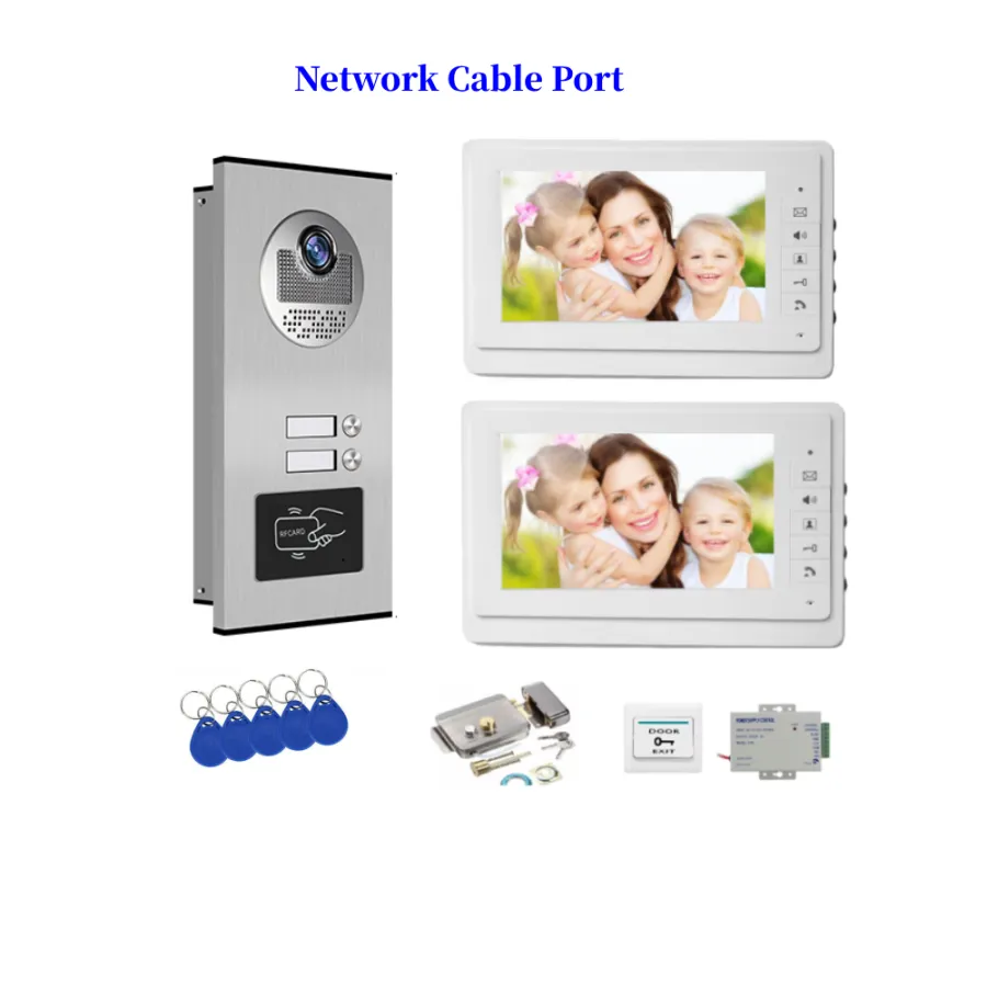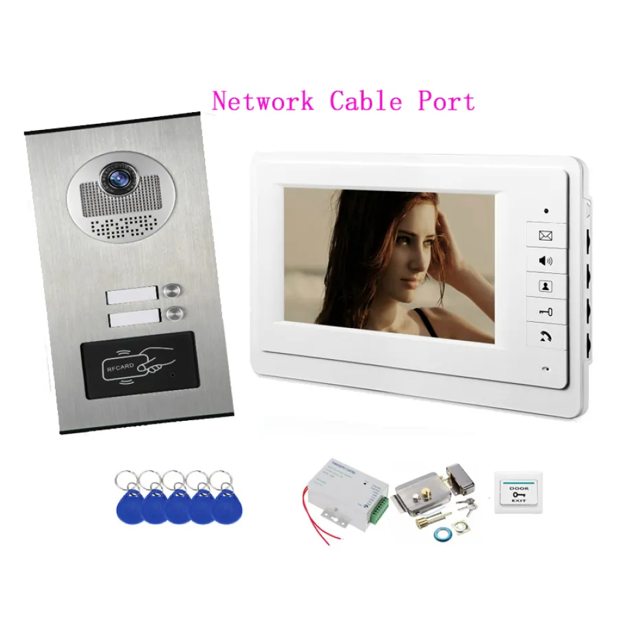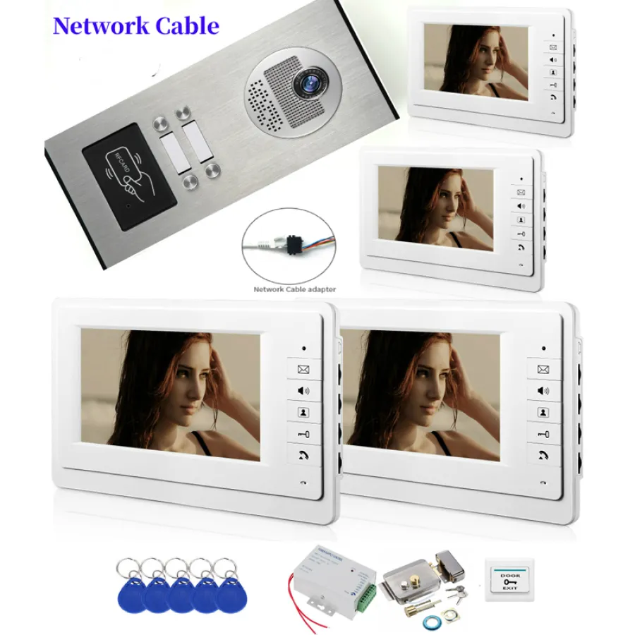 V70F-660-1V4=1pcs 2 Buttons Camera+4pcs Monitors+Adapter+5pcs RFID Keyfobs+1pcs Test Network Cable+Manual