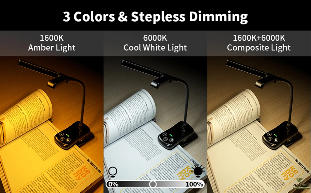 【3 Colors & 8 Brightness】- 14 LED book light for reading in bed come in 3 colors and 8 brightness dimming, and they can be paired with 24 modes to meet anyone's reading lamp needs. 1600K Amber color contains 6 LEDs, 6000K natural color contains 8 LEDs, combined color at 1600K+6000K contains 14 LEDs. With memory function, you can set a mode you like for long-term use, no need to repeat adjustment.