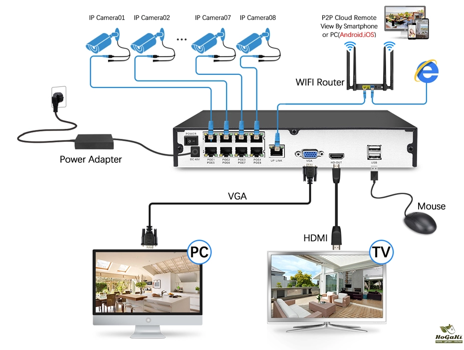 A real play and plug security! It features POE (Power over Ethernet), with a single cable connecting each IP camera to the NVR for both power supply and video and single transmission. Easy wiring - the wiring process can't be simpler for DIY enthusiasts and beginners