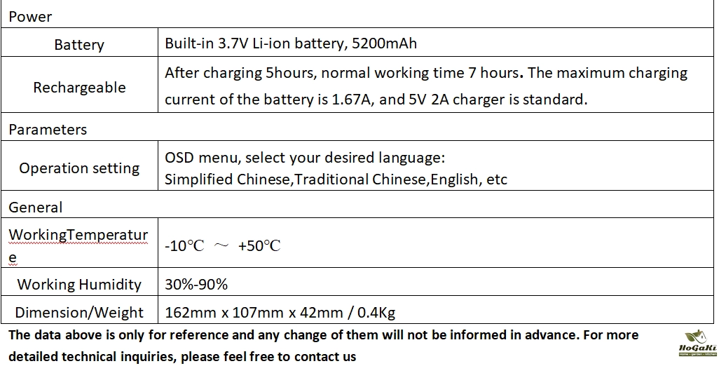 ● 3.7 V /5200mAh Li-ion Battery, after 5 hours charging, working time lasts 7 hours