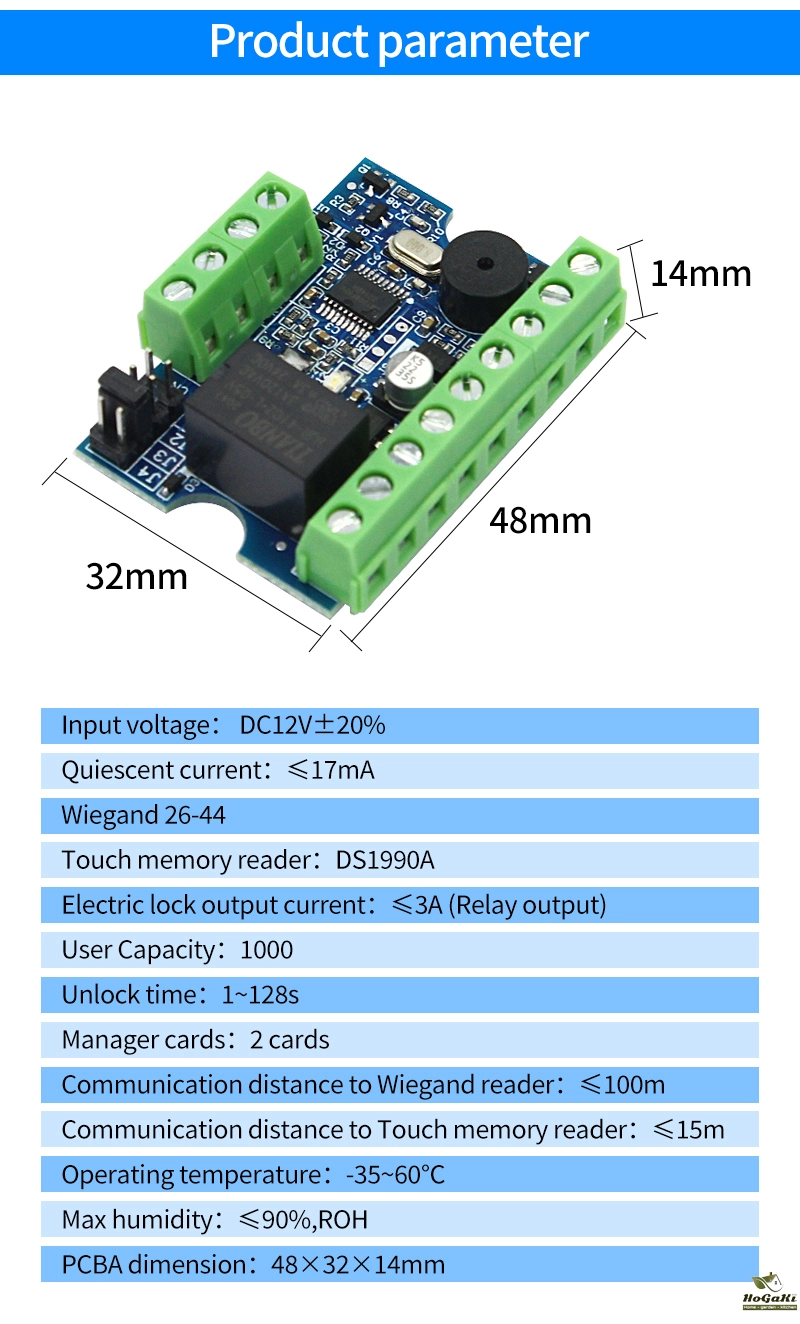 This access control is standalone access control which designed for single door. Support 1000 users and could connect to external Wiegand 26-44 RFID reader or Touch memory reader.
