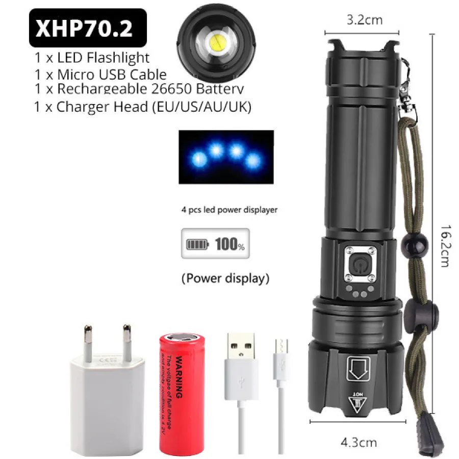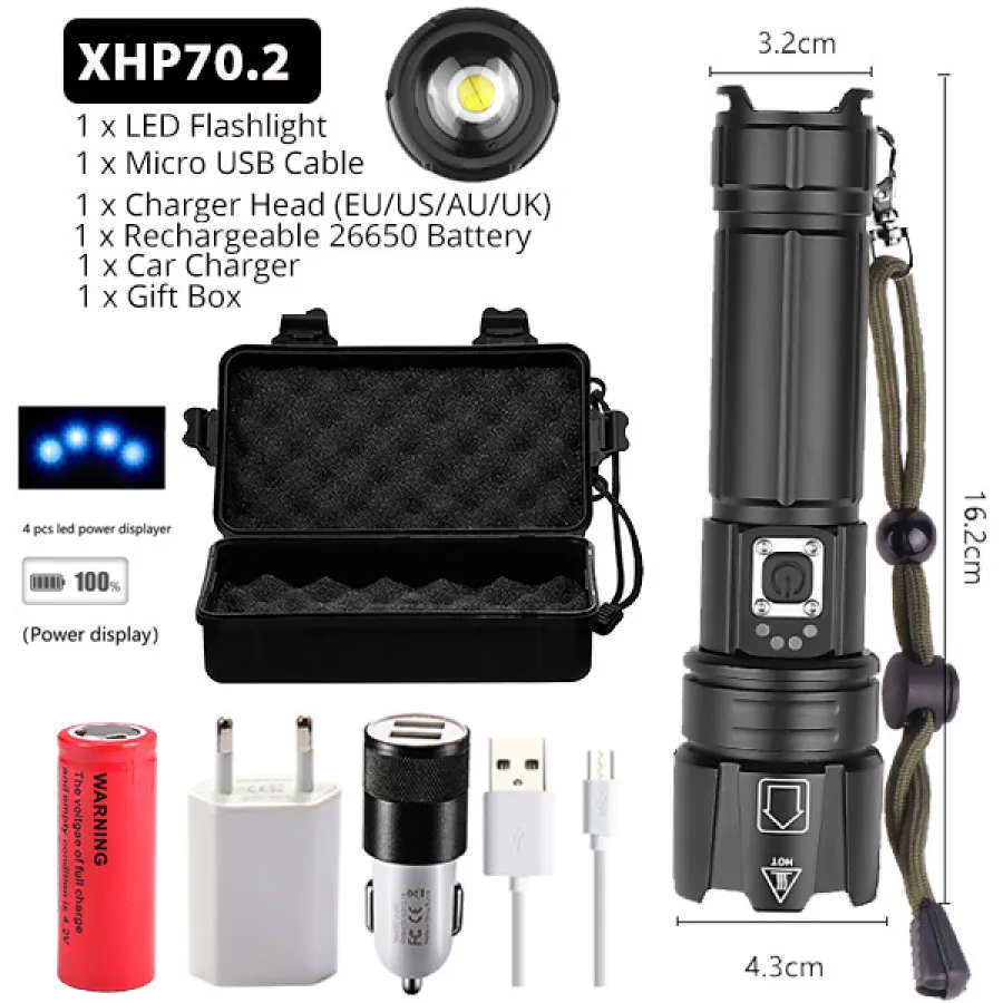 PACKAGE D: 1x XHP70.2 Flashlight+USB Cable+1 x Rechargeable 26650 Battery+1 x Charger Head (EU/US/AU/UK)+