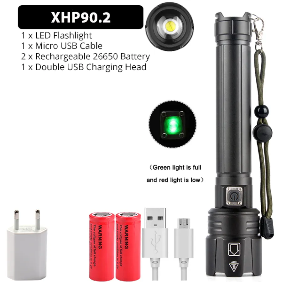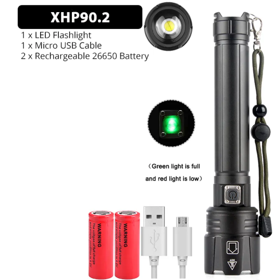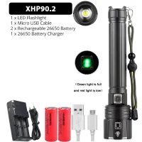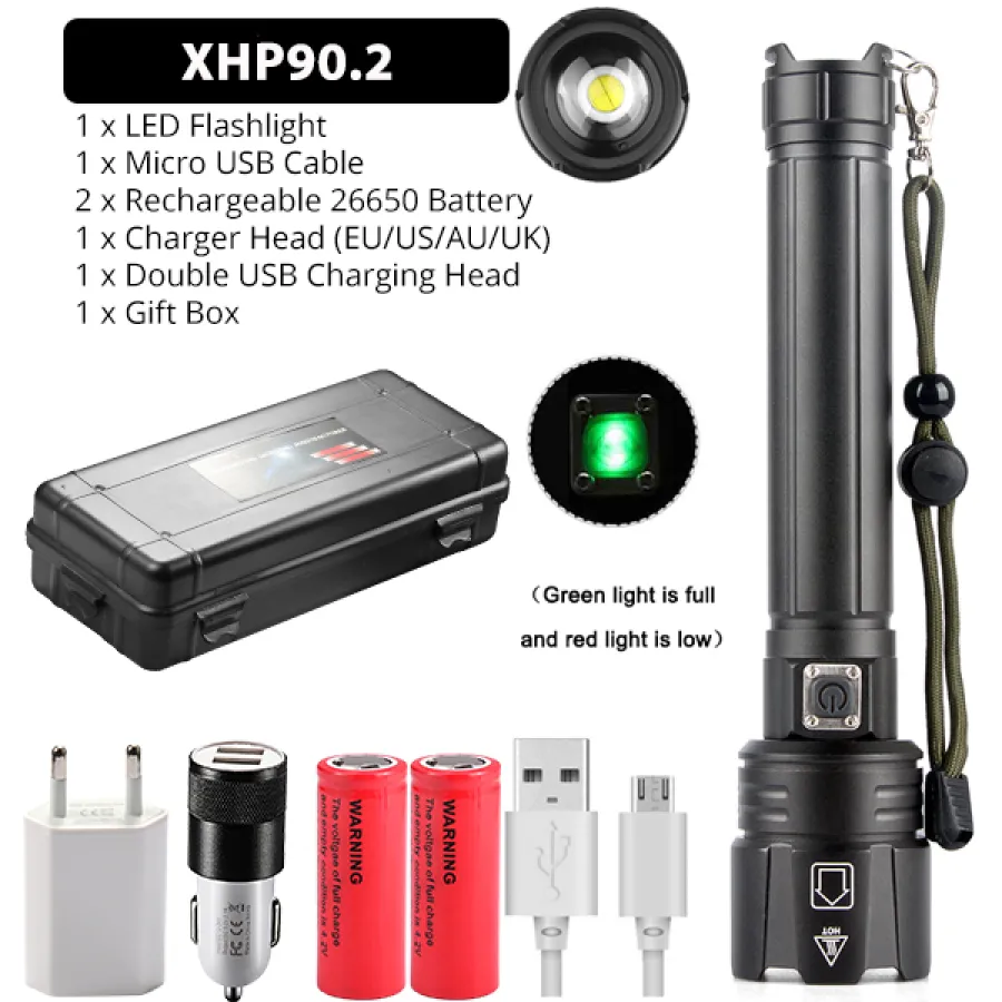 PACKAGE I: 1x XHP90 Flashlight+USB Cable+2 x Rechargeable 26650 Battery+1x 26650 Battery Charger.
