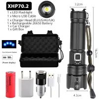 PACKAGE C: 1x XHP70.2 Flashlight+USB Cable+1 x Rechargeable 26650 Battery+1 x Charger Head (EU/US/AU/UK);