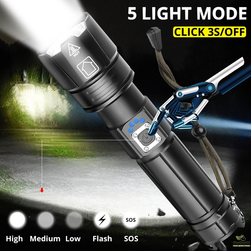 5 Switch Modes: 100% - 70% - 50%- Flash-SOS