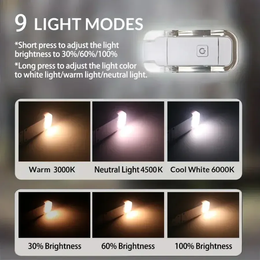 2.Long press to adjust the light color to white light/warm light/neutral light.