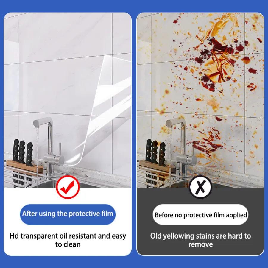 • Electrostatic Protection :The transparent electrostatic protective film offers superior protection against oil splashes, ensuring your wall stays clean and tidy.