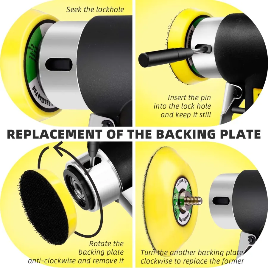 Ergonomic switch design / 360° omnidirectional rotary exhaust design / Air regulating valve: The speed and strength can be adjusted according to the work needs / Soft rubber-wrapped non-slip handle design / Eccentric double-rotation polishing method makes the random orbital polisher polishing effect more uniform and smooth.