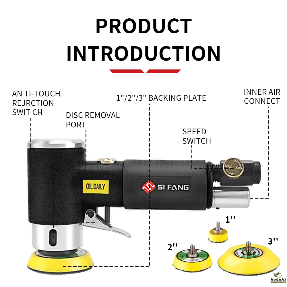 Ergonomic switch design / 360° omnidirectional rotary exhaust design / Air regulating valve: The speed and strength can be adjusted according to the work needs / Soft rubber-wrapped non-slip handle design / Eccentric double-rotation polishing method makes the random orbital polisher polishing effect more uniform and smooth.