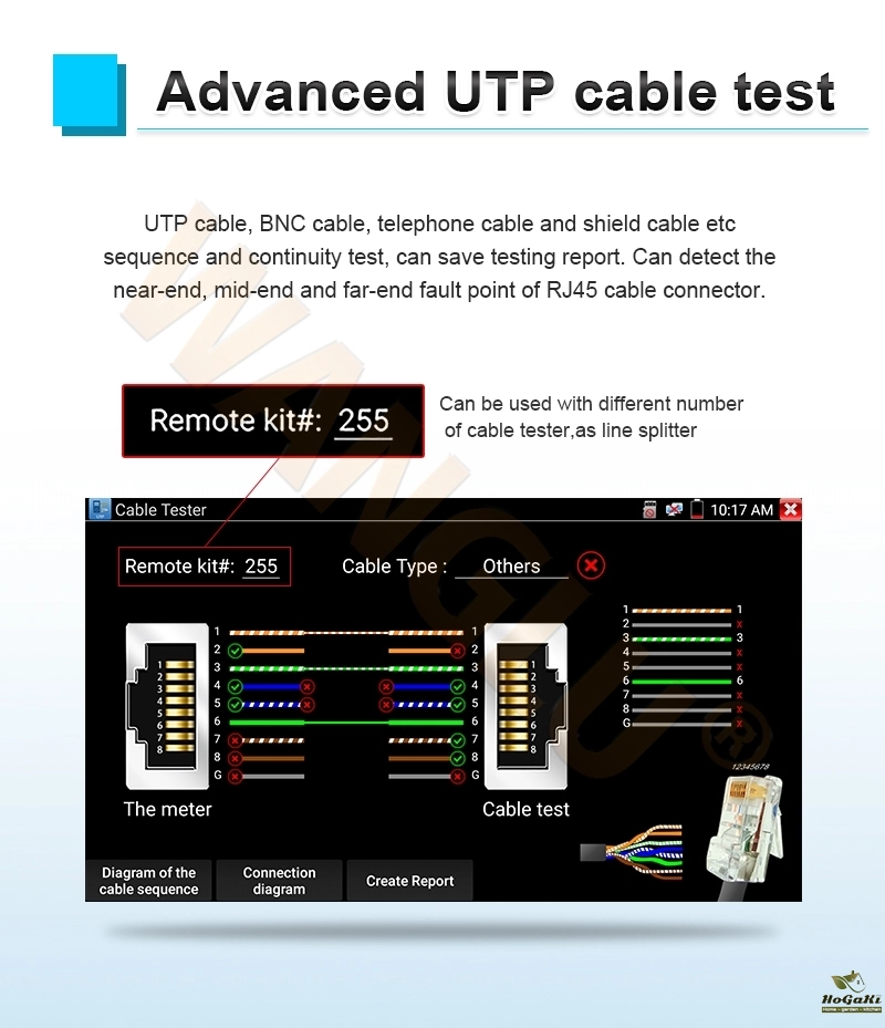 This Cable Tester is original accessary for CCTV Tester, No. 255 UTP cable test, it can detect the near-end, mid-end & far-end fault point of the RJ45 network cable connector.