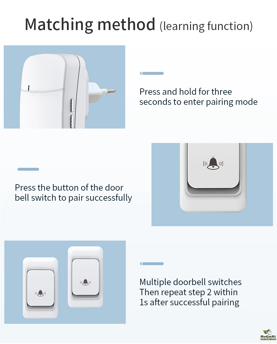 The receiver socket is plugged into a regular household socket. When the power is on, (if different transmitters need to correspond to different ringtones, first press the music button to select the ringtone) and then press the receiver mode button for about 5 seconds until the indicator light flashes. Enter the pairing mode, at this time, press the transmitter, the receiver rings, the pairing is successful.