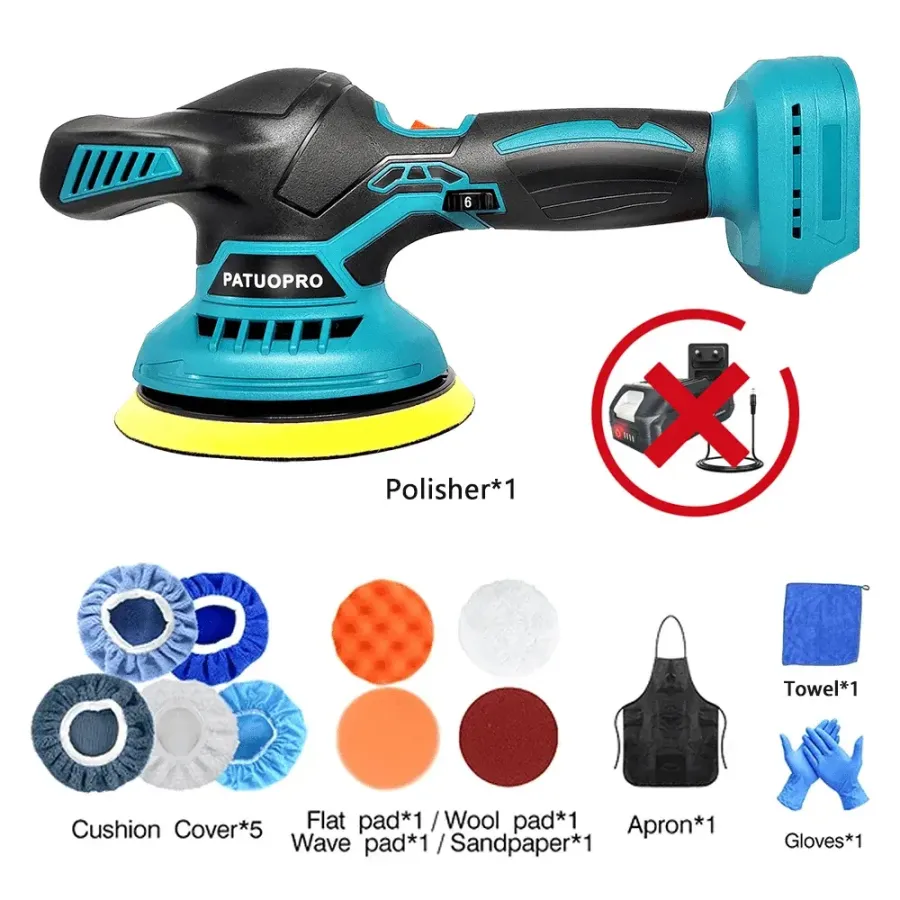4. Rich Combination : Cordless polisher has ample accessories, Flat Foam Pad *1, Wave Foam Pad *1, Wool Pad *1, Polishing Sandpaper *1, Cushion Cover *5, Protect Glove *1, Apron *1,Towel *1.