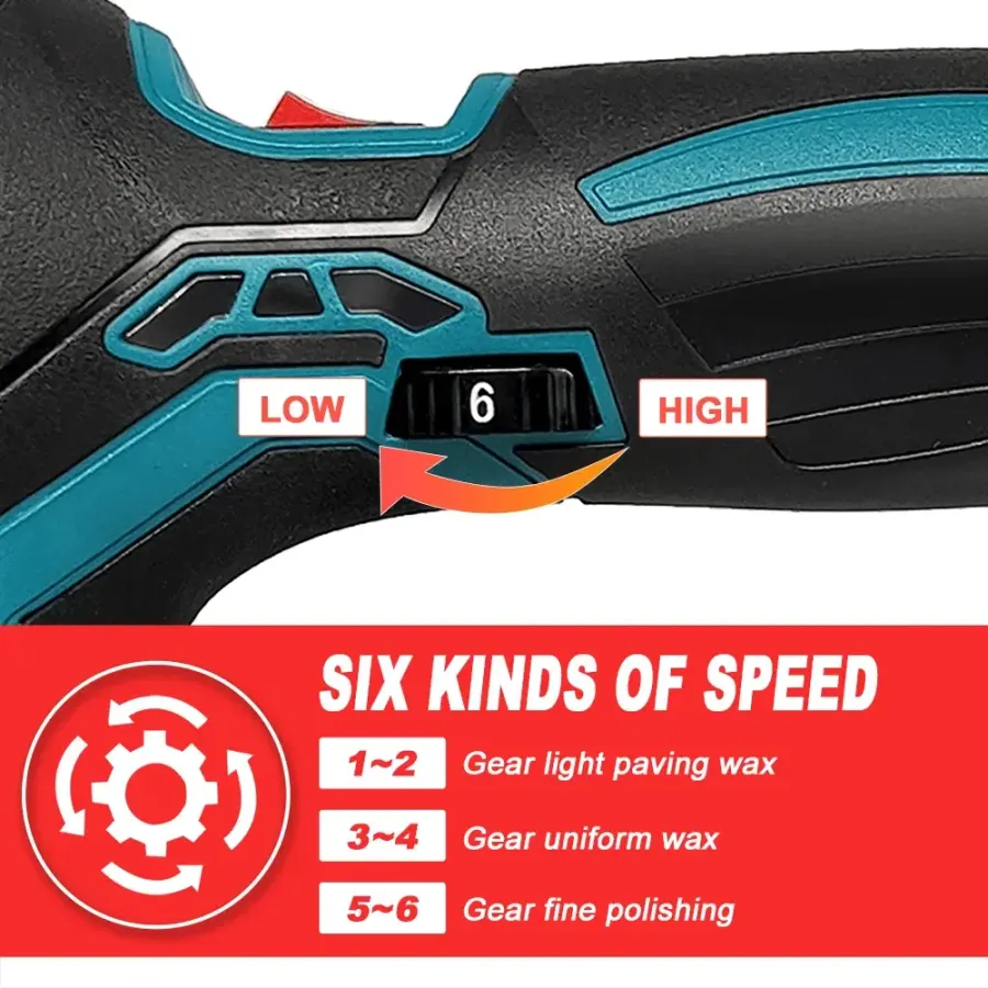 5. Adjustable speed 1-6 levels : Variable speed range is 2500-5000 RPM, Cordless Car Buffer Polisher is very suitable for polishing and removing stains on vehicles, cleaning sinks, sanding wood, polishing furniture and other scenes.
