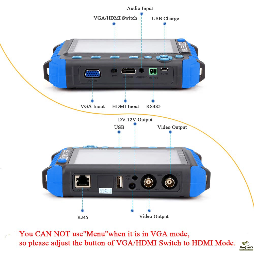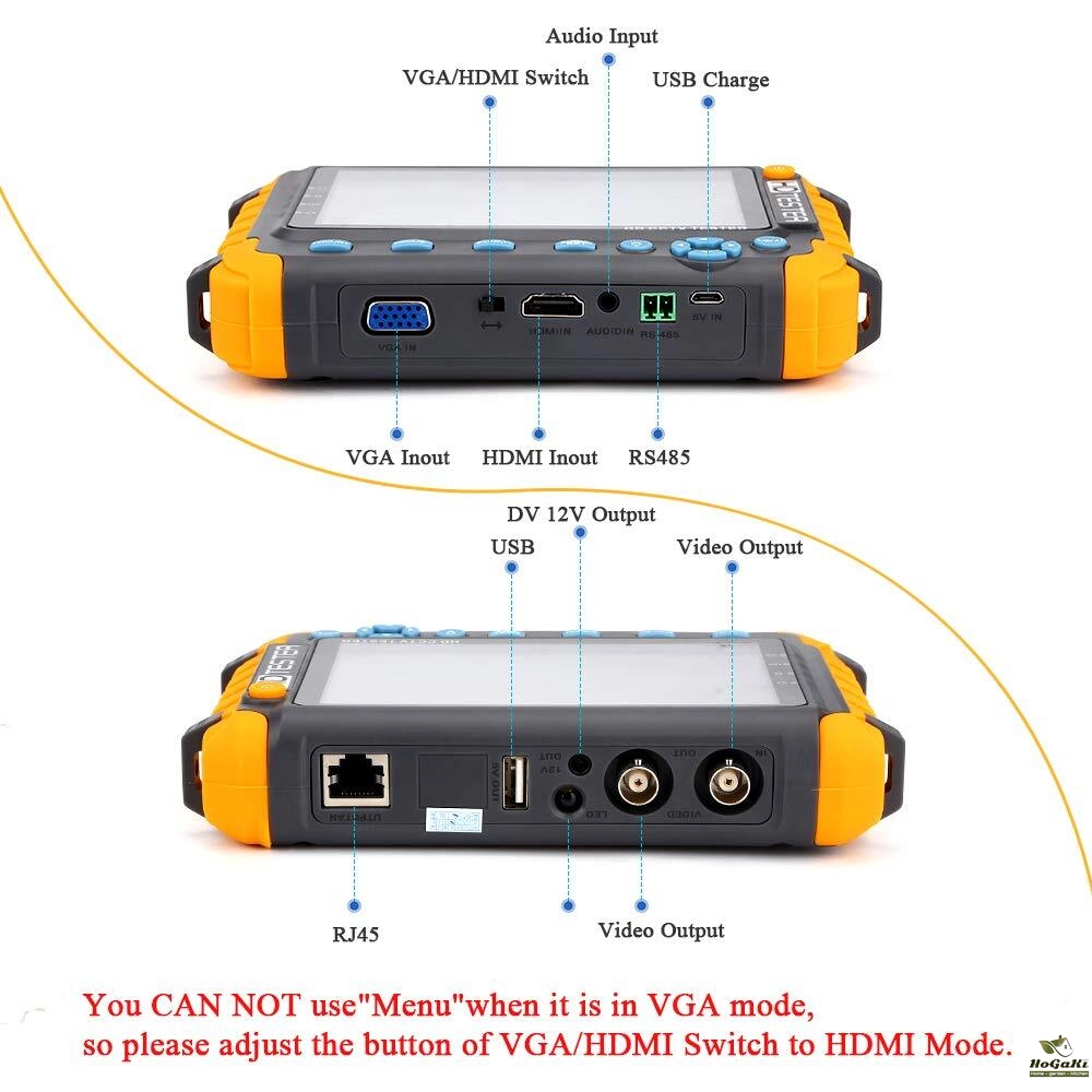 VGA/HDMI Input,it support VGA/HDMI 1:1 compliant digital input,once connect VGA/HDMI video,please switch selector to select VGA/HDMI Mode,The maximum resolution is 1920*1440. Video monitor tester, High-resolution 5.0 inches 800 (RGB) x480 wide viewing angle display, Viewing angle larger, more intuitive and easy to display the camera image quality. Support PAL/NTSC standard video signal.