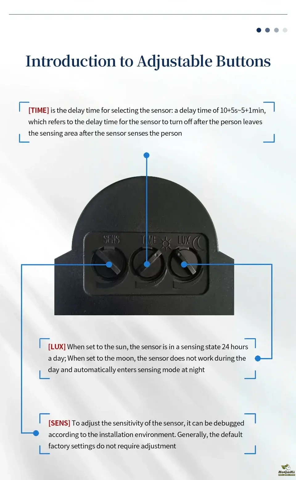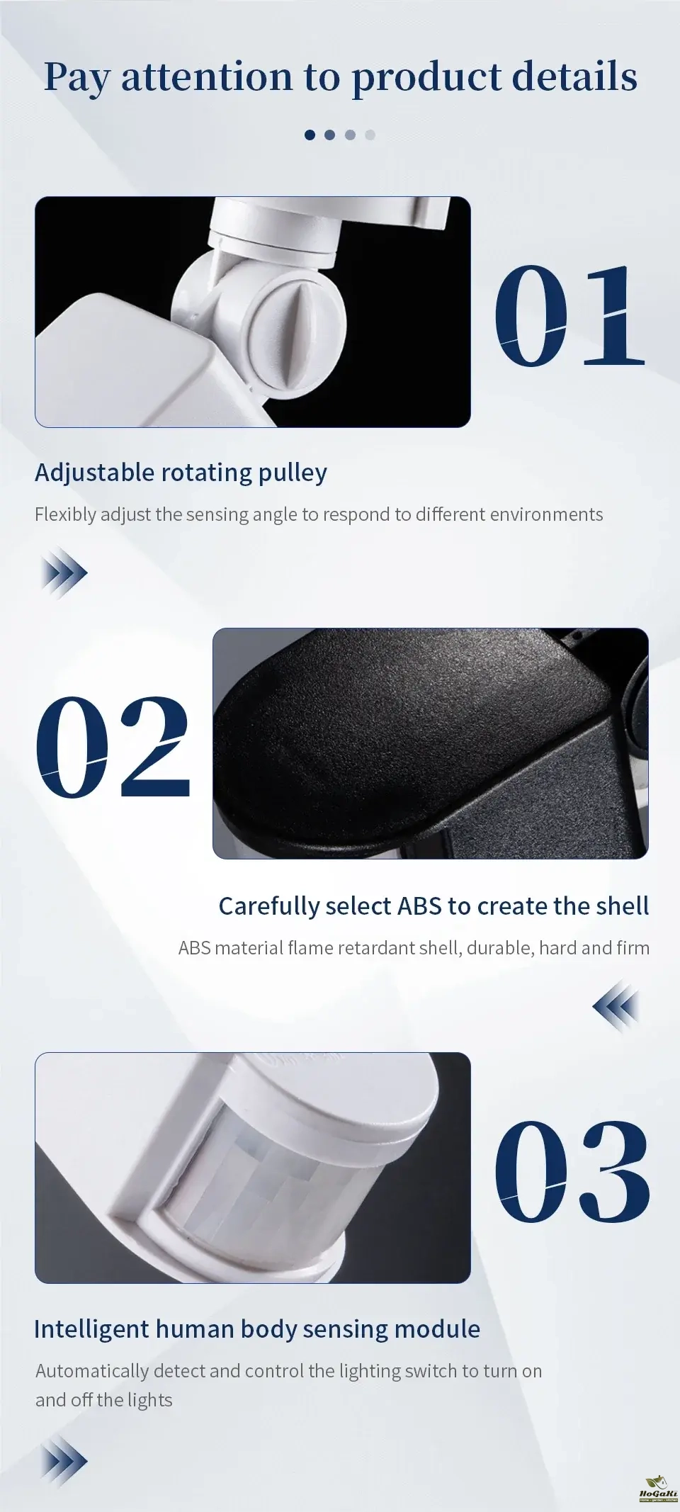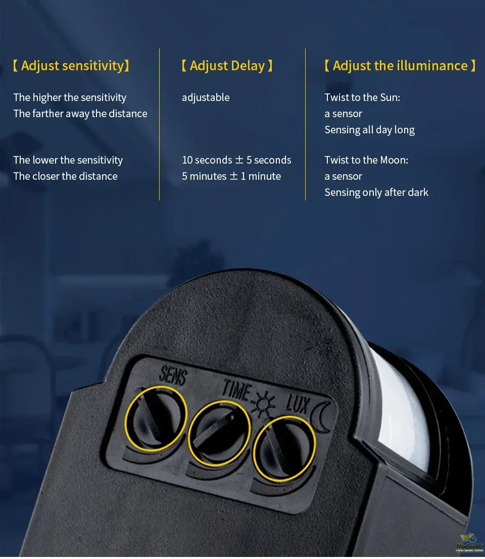The smart new products, increase the sensor sensitivity can be adjusted (using the SENS knob to adjust) function, increasing the sensor head can be up and down and left and right (up and down 90 degrees, about 160 degrees) can adjust the function, but also increased the induction angle. Product systemic waterproof, can be used indoors and outdoors.