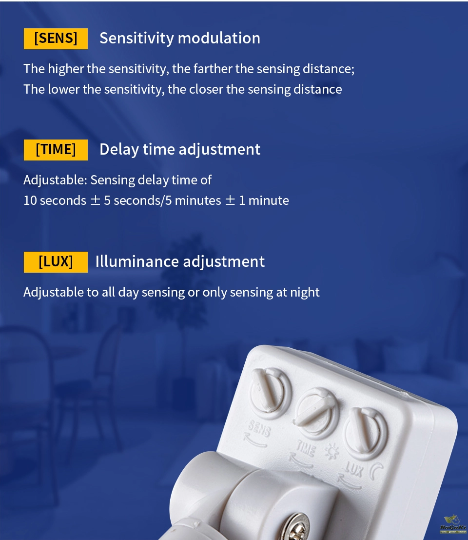 The delay time refers to the time when the sensor leaves the sensing area after the sensor senses the person and the sensor delays the time.