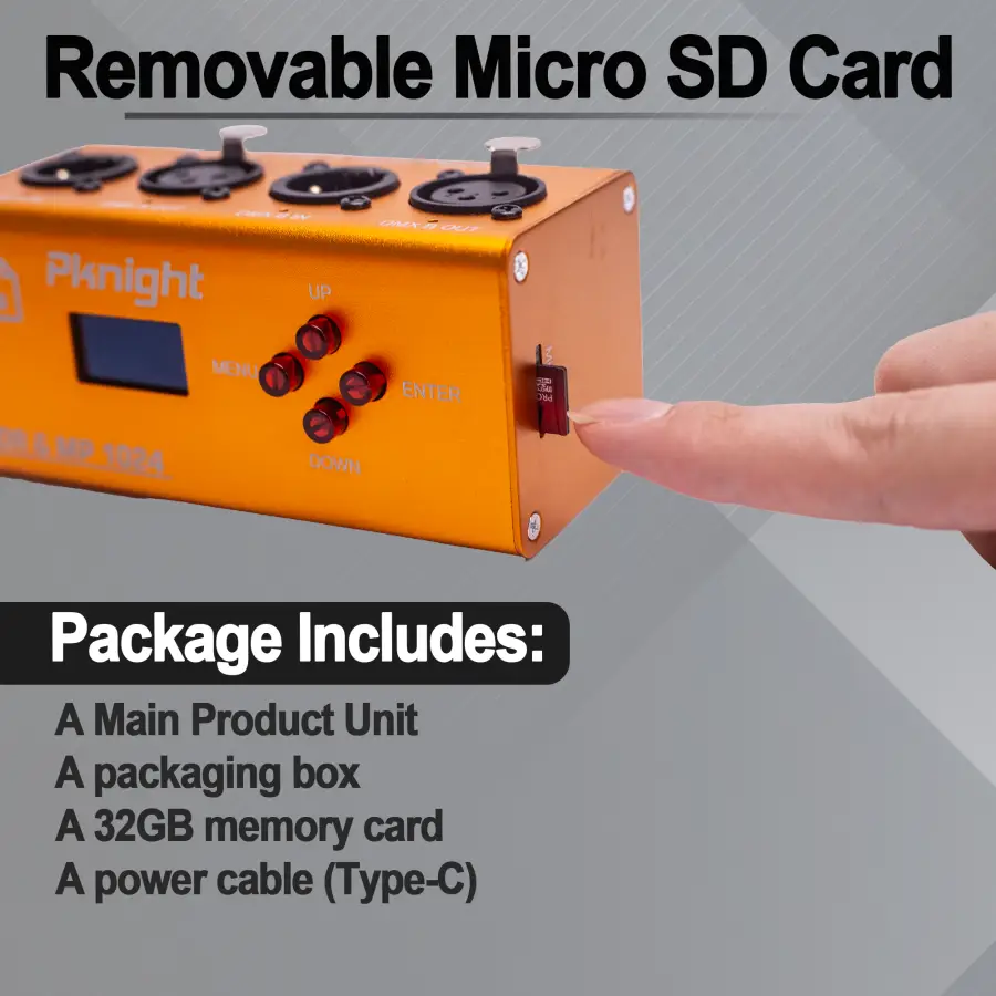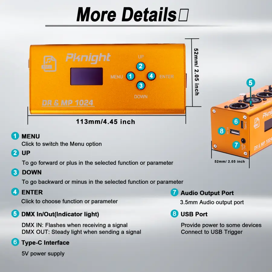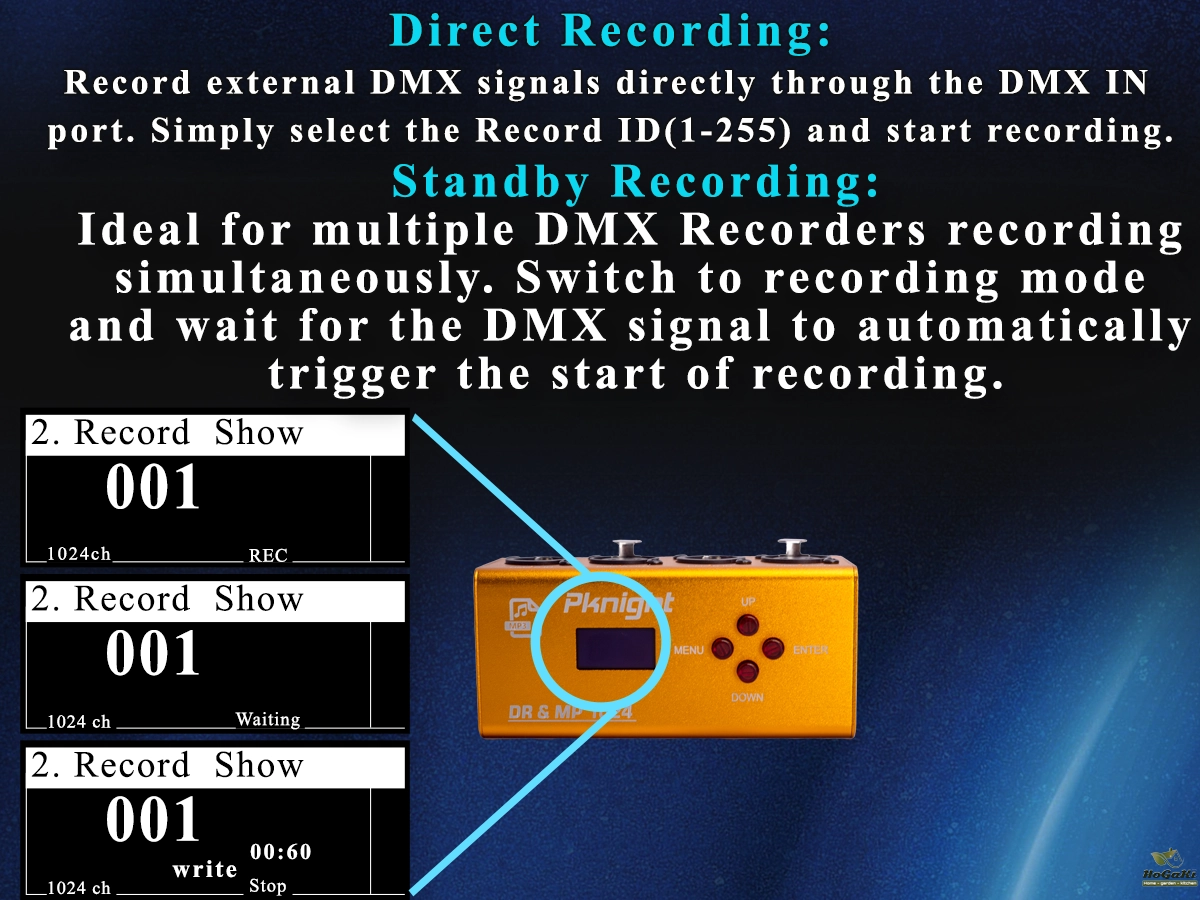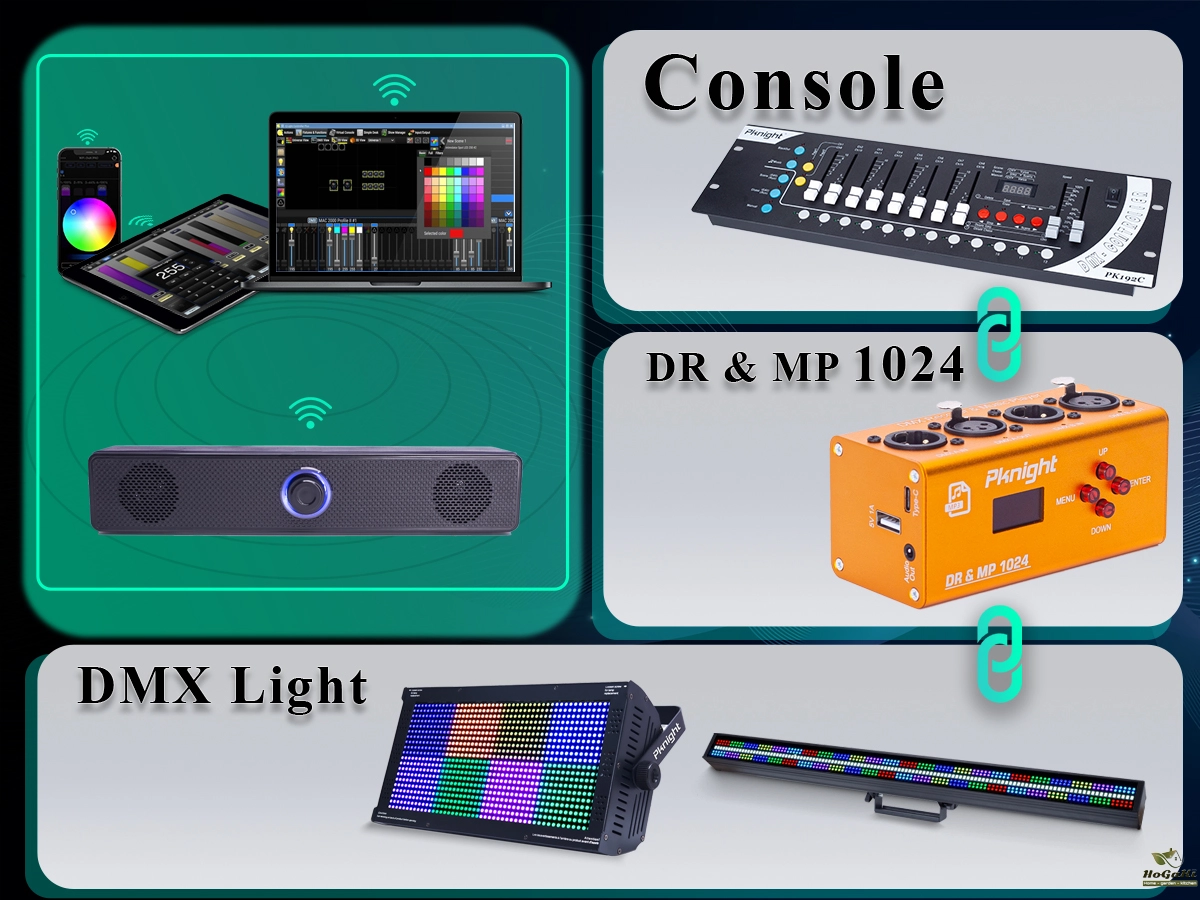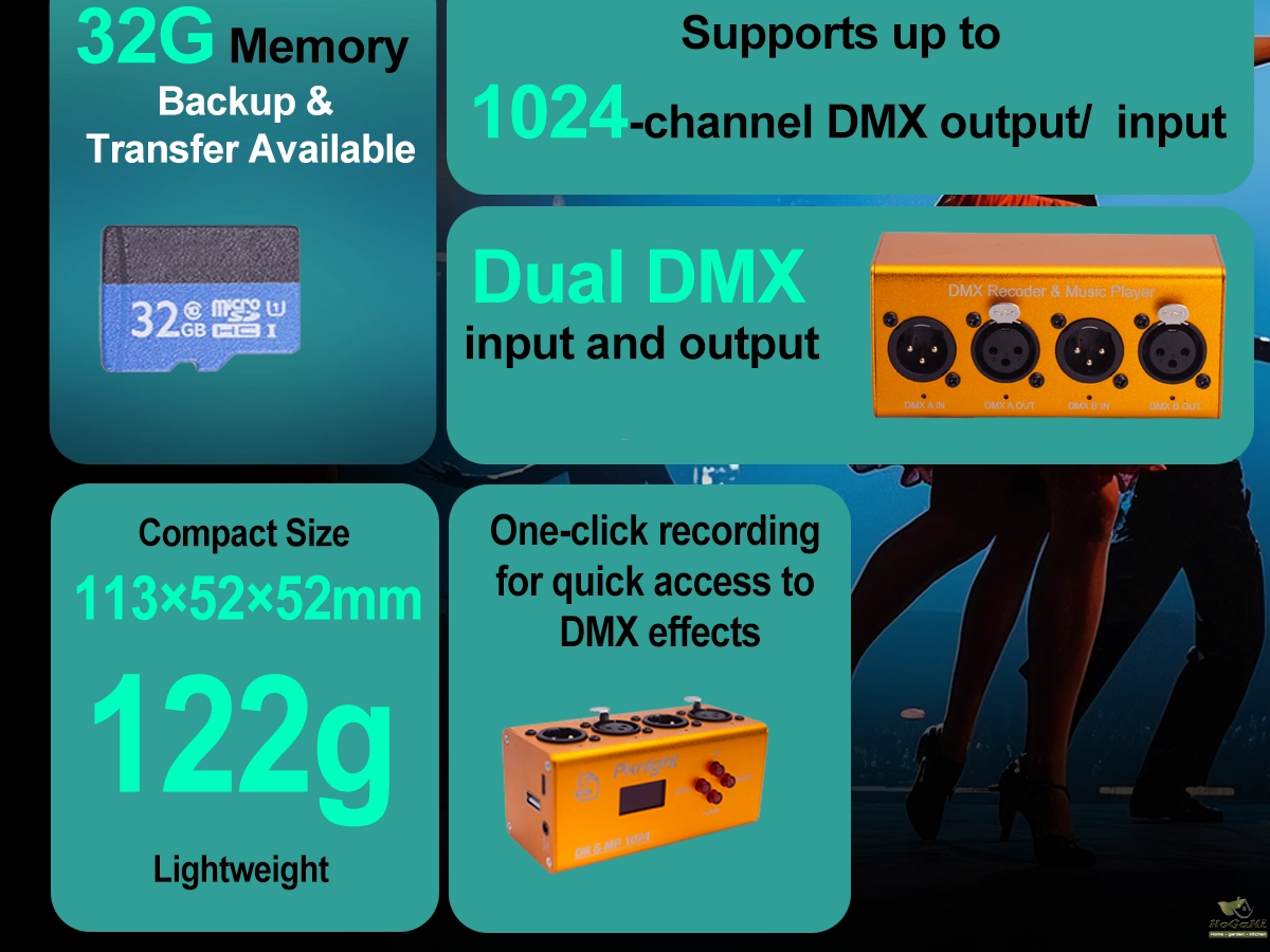 This DMX lighting controller (DR & MP 1024) offers precise control of up to 1024 DMX channels (2 universes), ideal for professional stage lighting, DJs, clubs, theaters, and events. Easily store and access up to 255 custom DMX programs with intuitive Record IDs for quick selection.