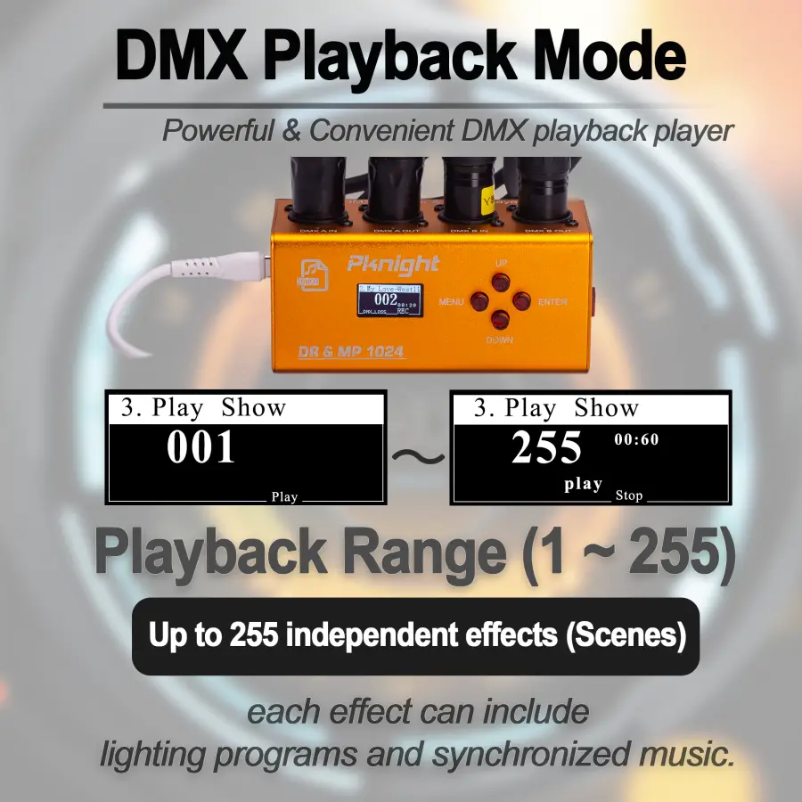 A: It offers flexible playback modes, including single-run playback based on music or DMX program duration and continuous loop playback. Additionally, it automatically resumes the last active program after power interruptions.