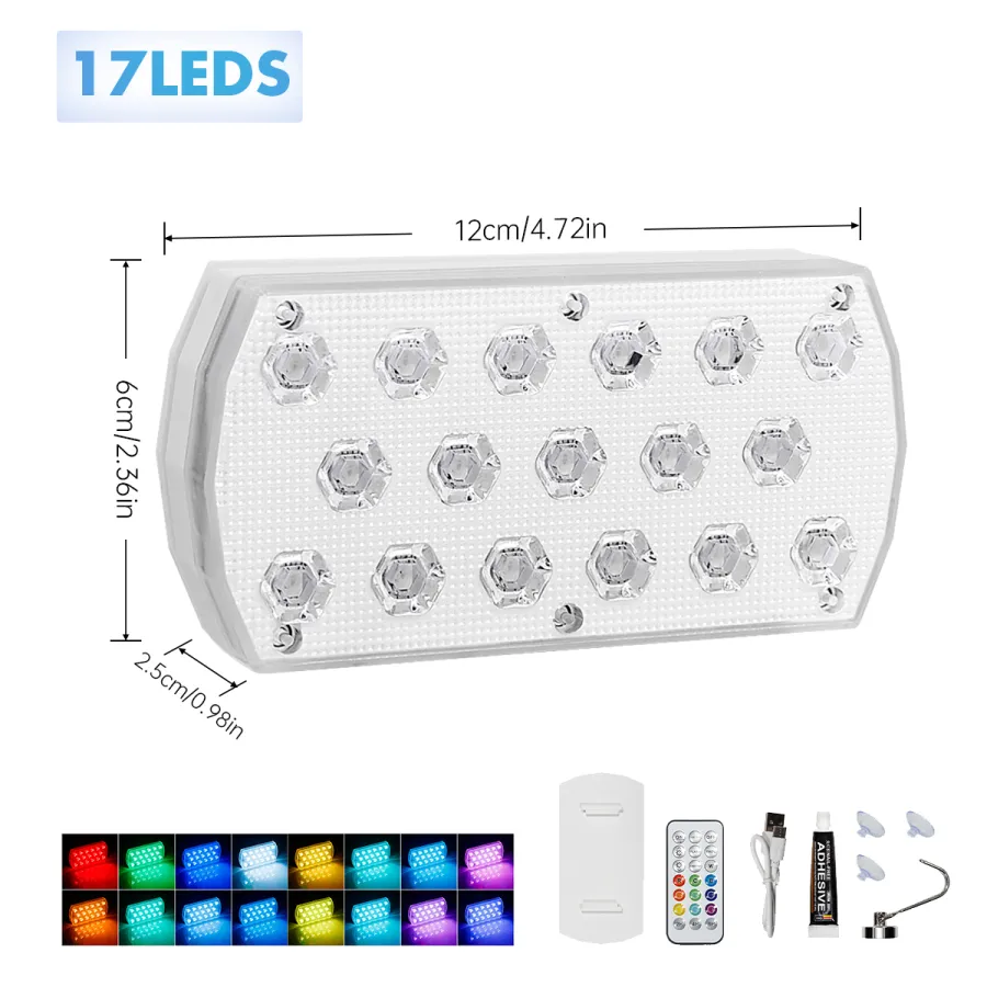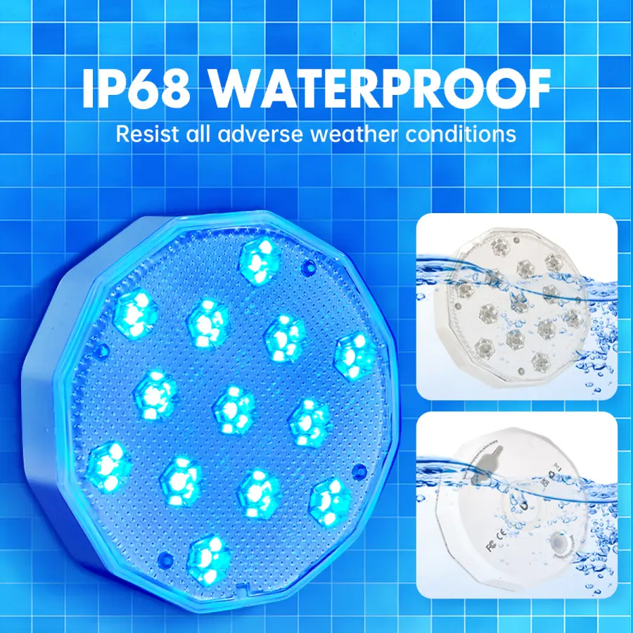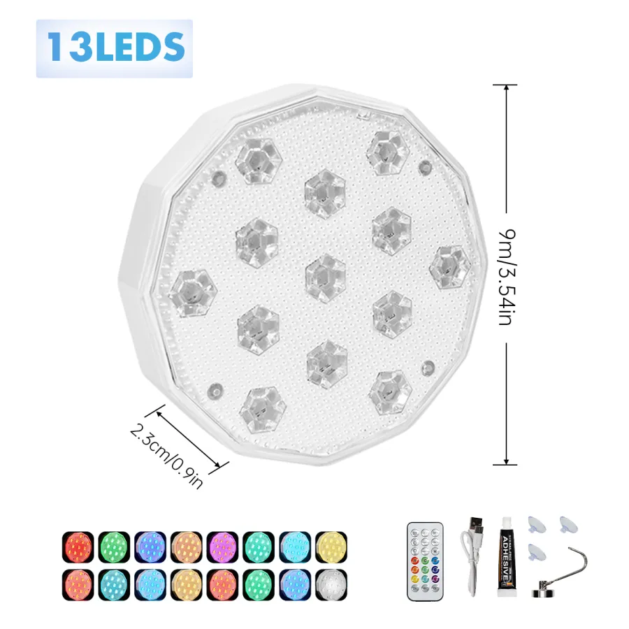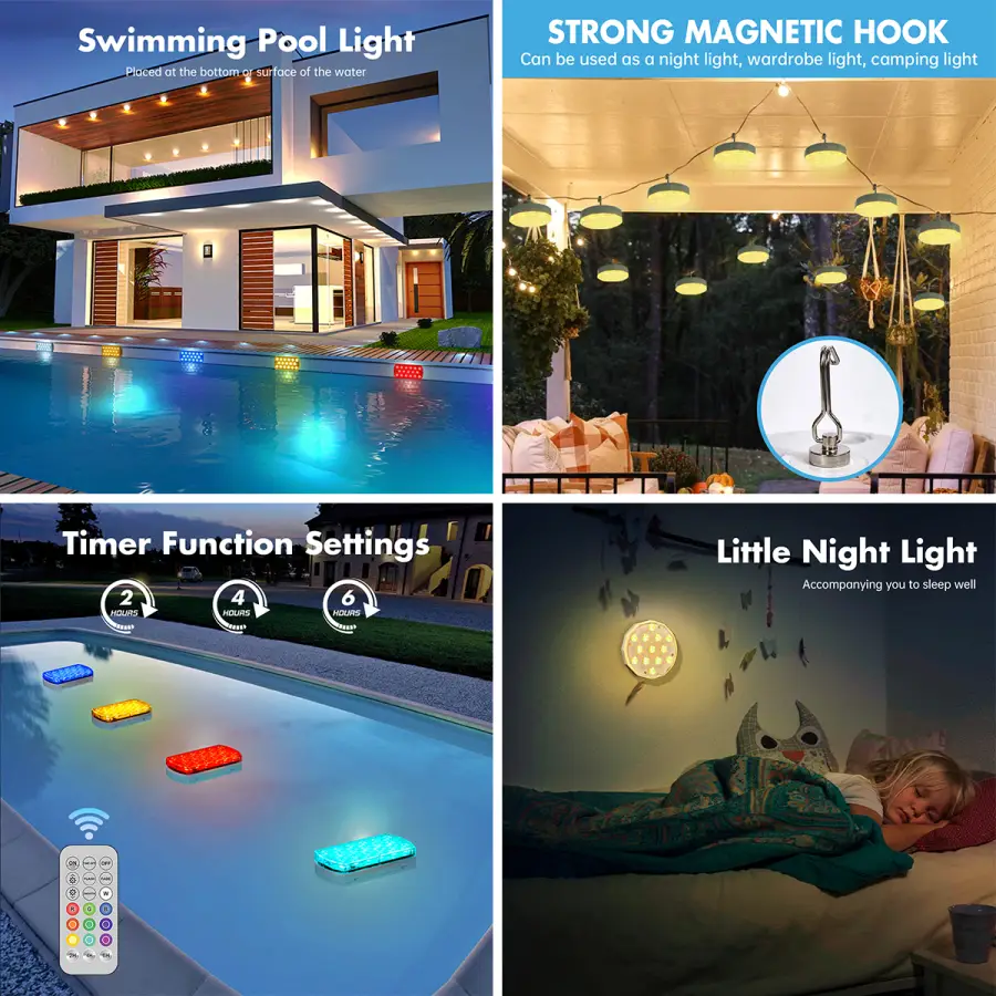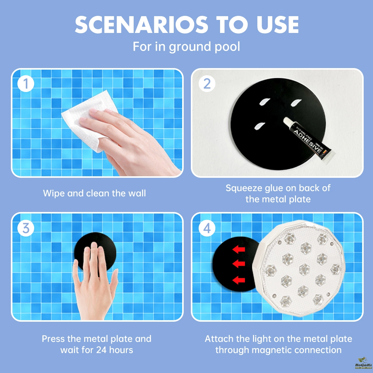 【Suitable for all wall surfaces 】--2024 Newest Underwater Pool Lights use 4 different mounting methods.A Matching professional glue has high strength, both smooth and uneven surfaces are suitable, safe and environmentally friendly.B Built-in super magnets can be easily adsorbed on metal surfaces.C Suction cups can also be used on smooth enough wall surfaces with ease.D Strong magnetic hooks can be used as a night light, closet light, camping light, and hang wherever you want!