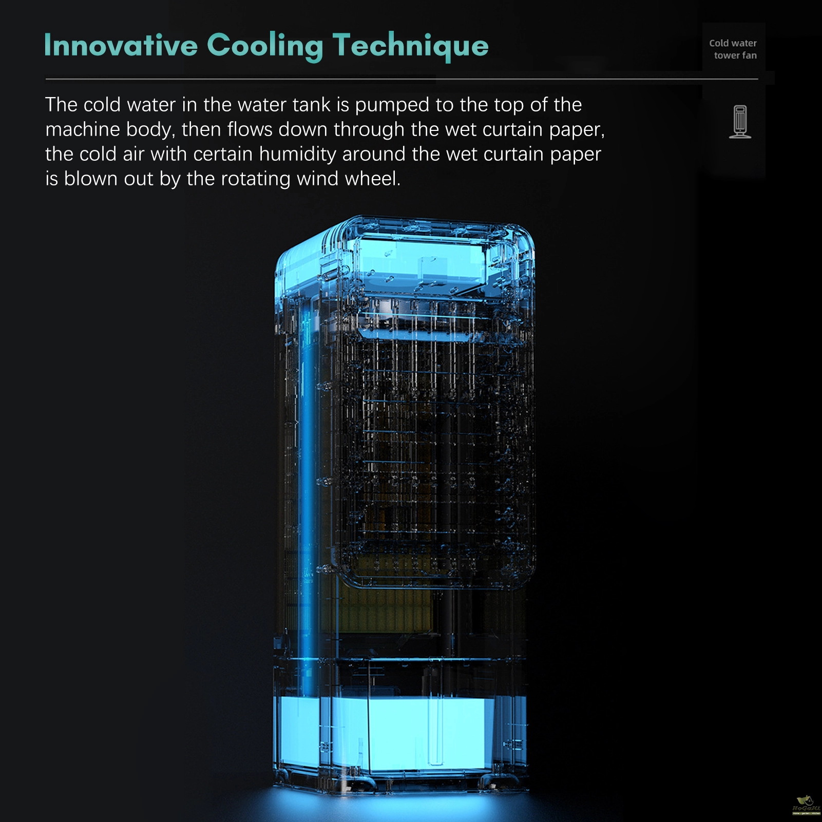 ♦ Upgrade Air Cooling Conditioner: The cold water in the water tank is pumped to the top of the machine body by the water pump, then flows down through the wet curtain paper, the cold air with certain humidity around the wet curtain paper is blown out by the rotating wind wheel. 3 speeds wind adjustment, you can choose the perfect wind speed according to your needs.