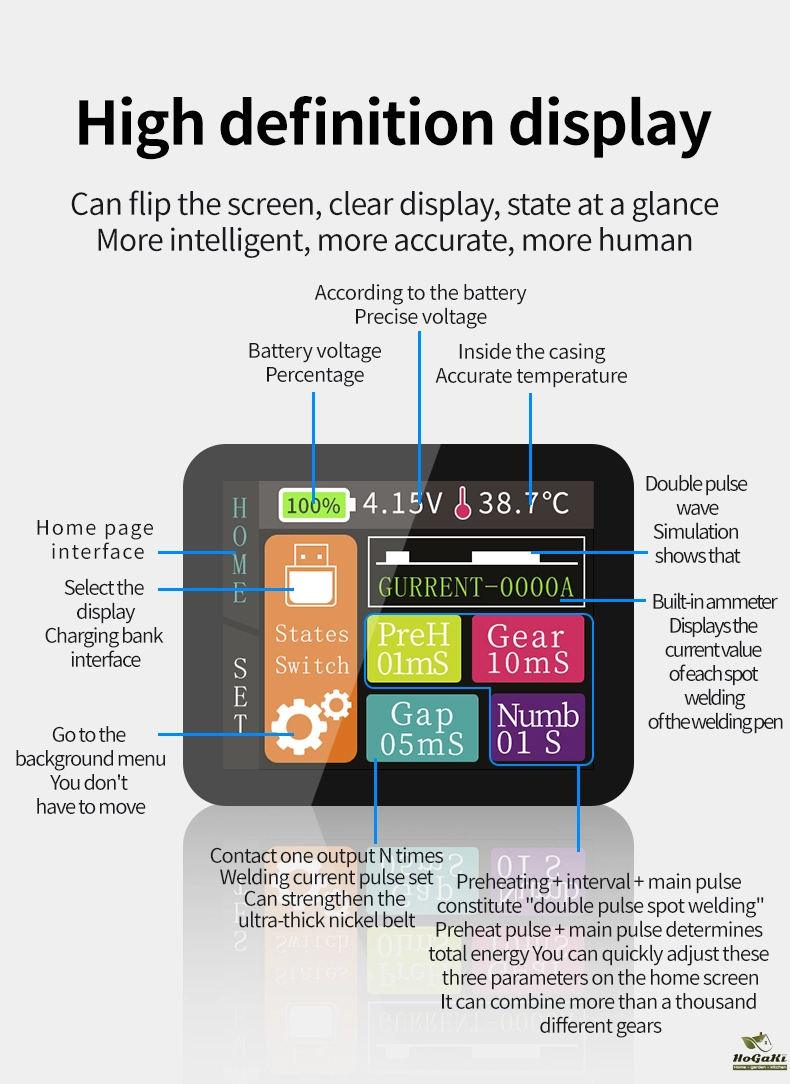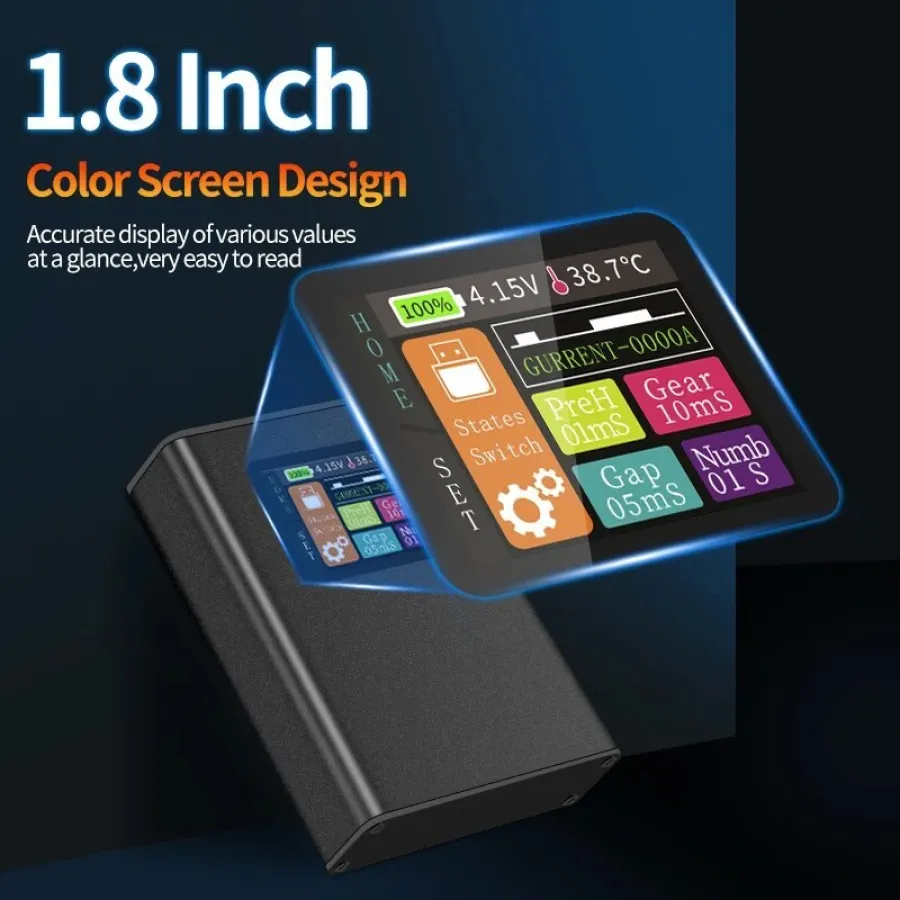 3.LCD Visible Colorful Screen Display: This mini spot welder has a 1.8-inch LCD color screen display, supports automatic working mode, with functions of low battery charge reminder, real-time circuit board temperature monitoring and high- temperature reminder, menu settings, sound switch settings,screen display flip, welding spot count, automatic shutdown and other functions.