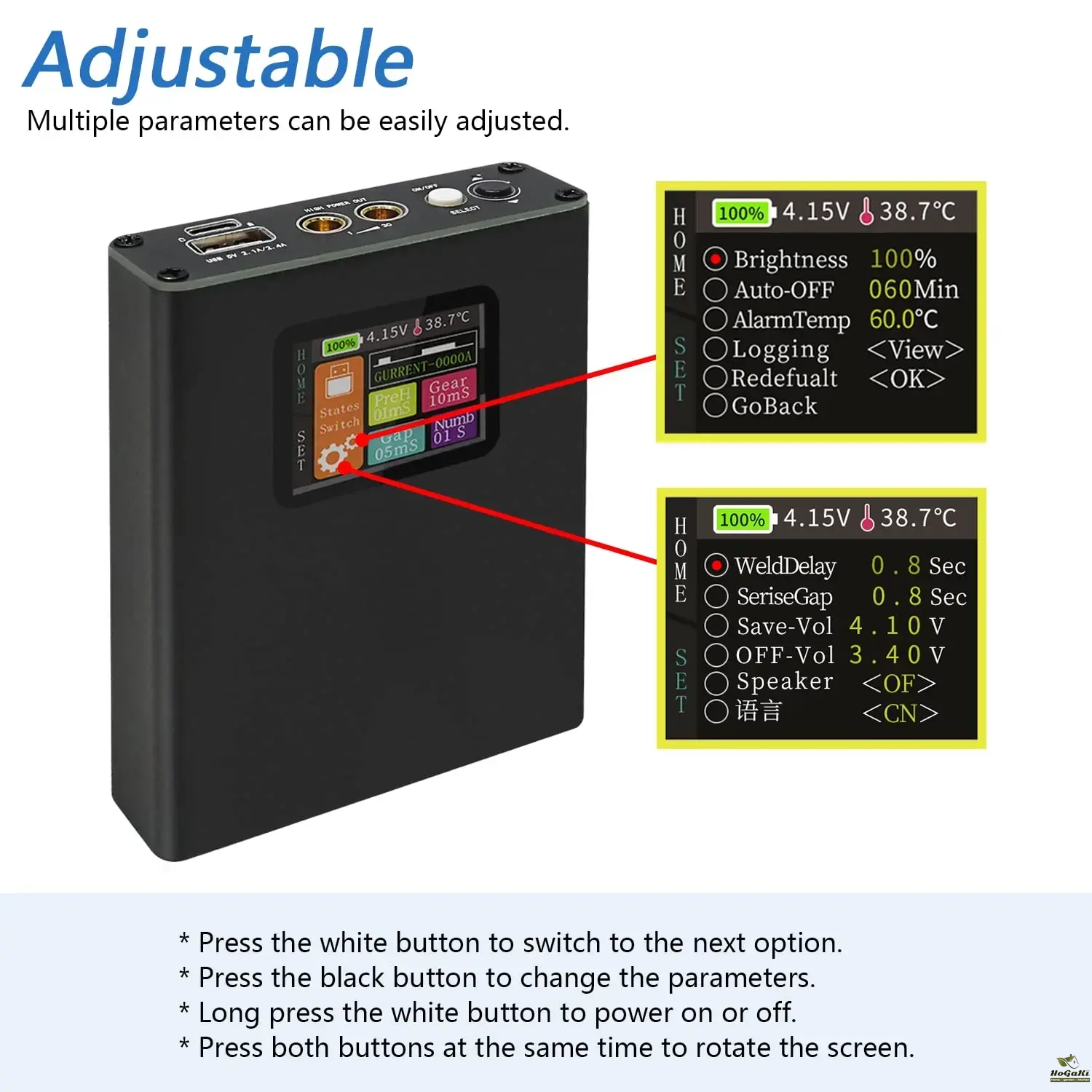 Performance: Over-current short-circuit protection, 0.15mm full electric welding, professional-grade development and parameter adjustment, pure copper solid thick welding pen, one-year standby in low-power, accurate power bank interface, built-in welding ammeter, over-temperature protection, use record query, timing automatic Power off, super fast charging, low current protection, screen brightness adjustment, silent mode.