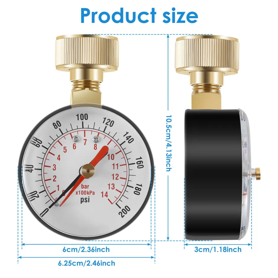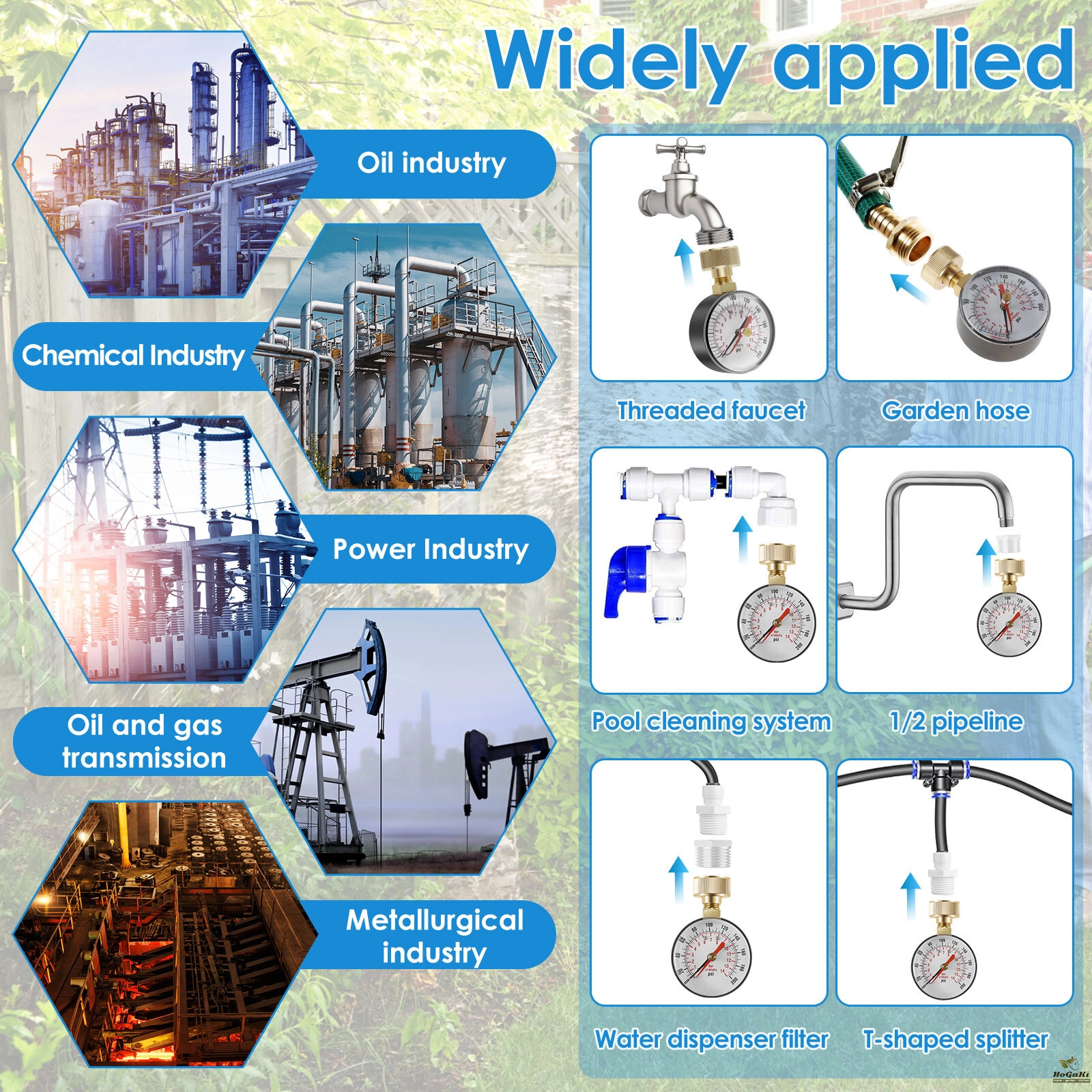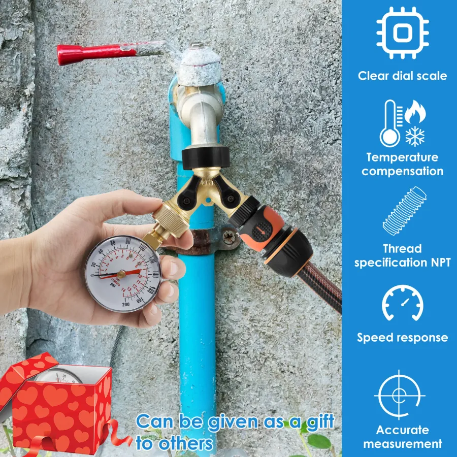 1. [Purpose] This water pressure test gauge can be used to measure water pressure in irrigation systems, homes, etc. It is compatible for garden hoses, hose faucets, outdoor faucets, water pumps and more.