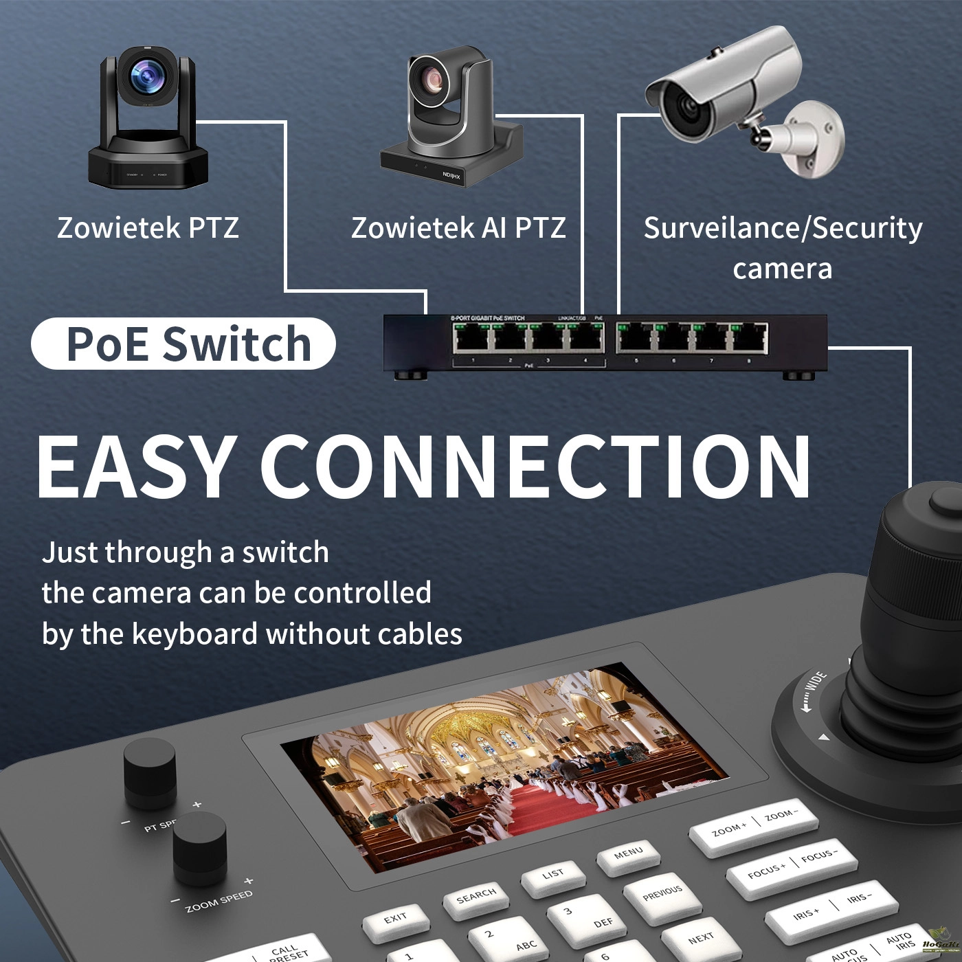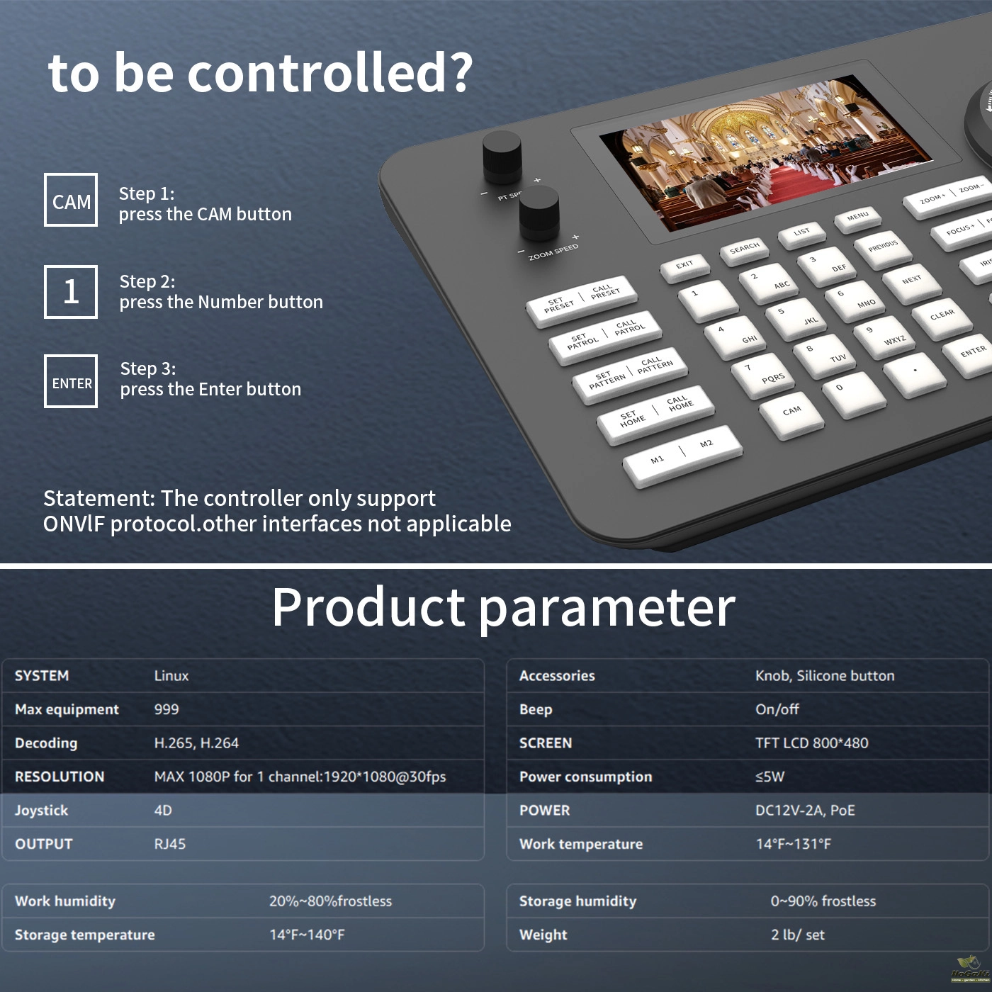 Network control keyboard with decoding function. It has strong maneuverability and effectively solves the problem of inaccurate and inconvenient mouse click control. High-end atmosphere, unique surface hardening can effectively prevent scratching; 5 inch LCD screen display is excellent, image decoding experience is better.Supports the standard Onvif protocol, with good compatibility, strong scalability, and easy operation. It only takes a few steps to achieve perfect control of the network dome.