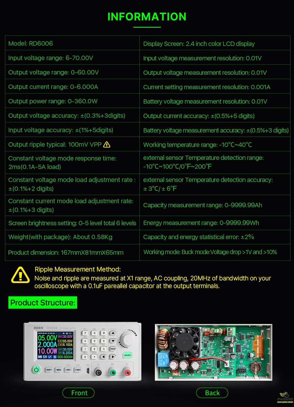 ①:Ripple measurement method: noise and ripple are measured at X1 range, AC coupling, 20MHz of bandwidth on your oscilloscope with a 0.1uF parallel capacitor at the output terminals