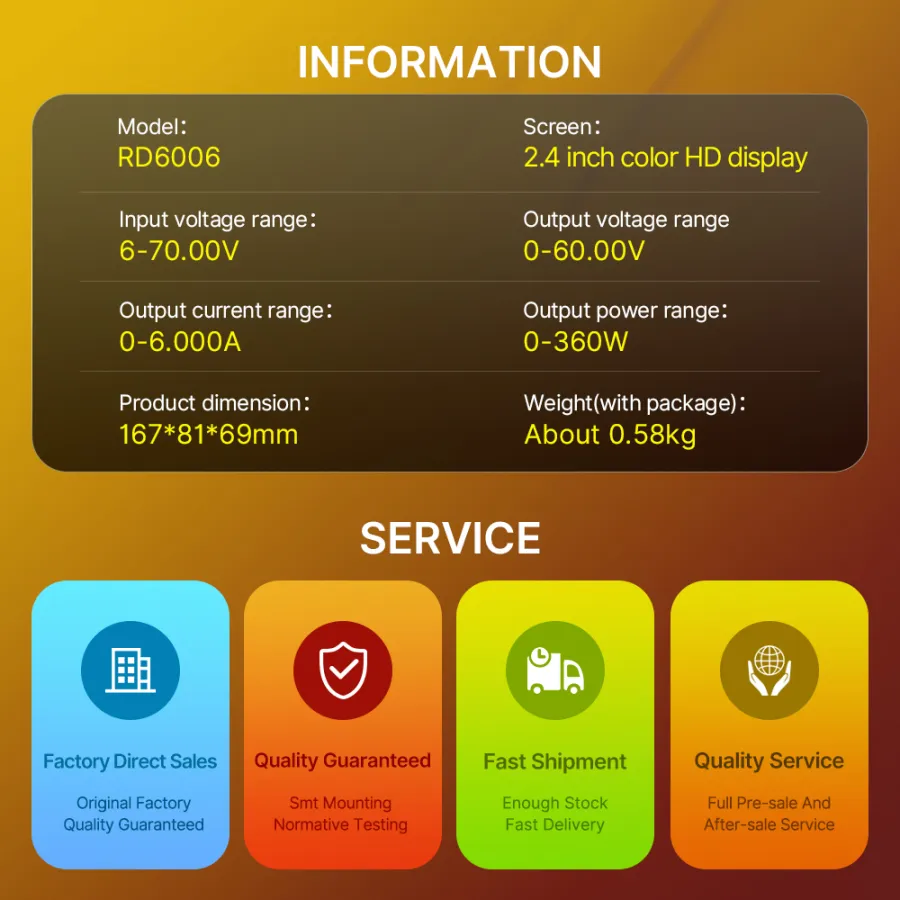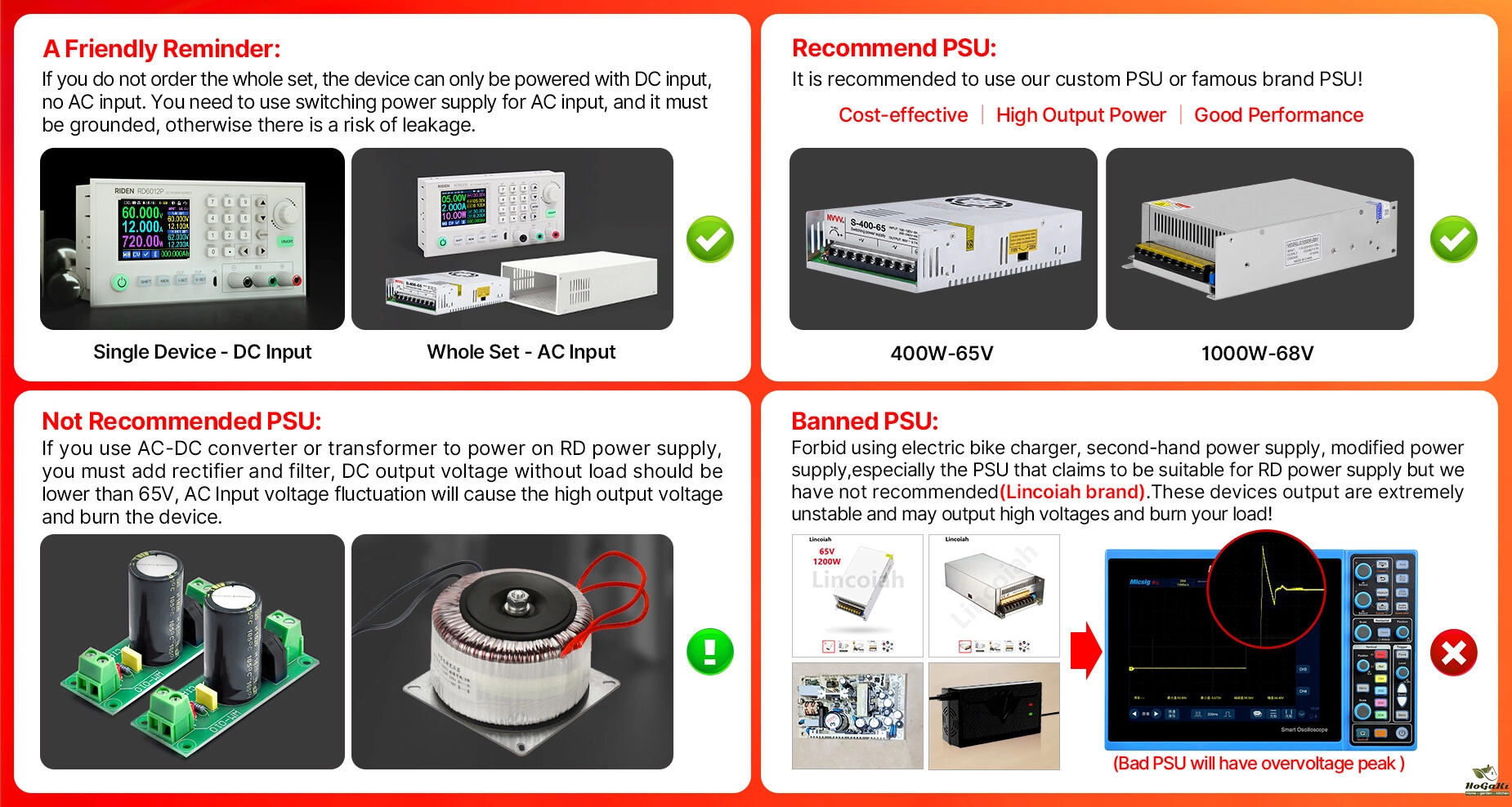 If you order the PSU, after getting the PSU, please use multimeter to check if the real output voltage is stable and fits the rated voltage, to see if it is damaged on the way, if the output is abnormal, please contact us, do not connect it to RD power supply to avoid more loss
