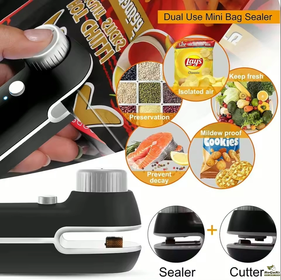【2-in-1 Sealing&Cutting】This delicate compact mini bag sealer is a practical kitchen gadget with both sealing and cutting functions. Using this handheld heat sealer, you can seal up the opened snacks and keep them fresh, also with the built-in sharp blade to reopen the package easily. Enjoy fresh and crispy snacks every time.