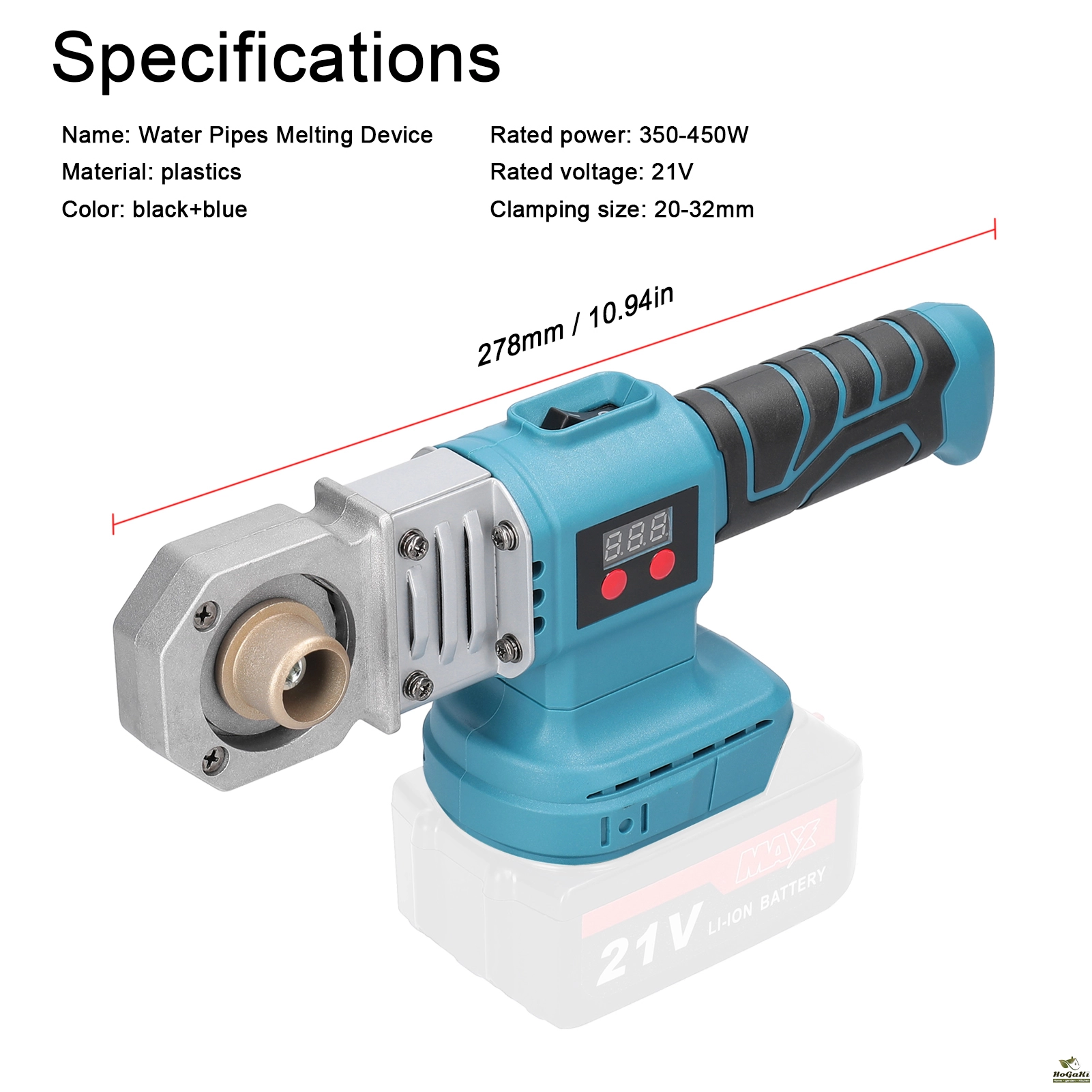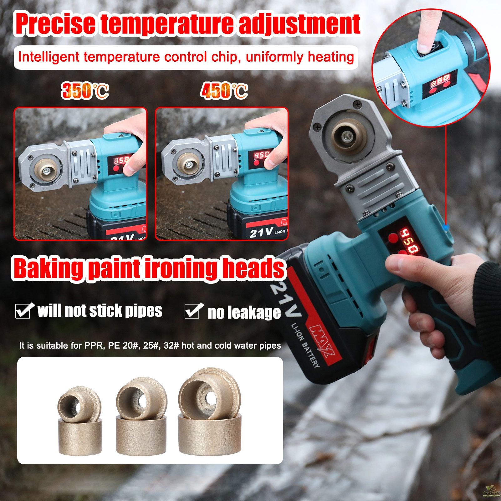 This water pipes melting device is high power design, quick heating, highly efficient, with uniform and stable heat conduction. Intelligent temperature control chip, uniformly heating, support for precise temperature adjustment of 350-450℃. Equipped with 3 different specifications of ironing heads, 20mm, 25mm and 32mm, it is easy to change according to the different usage. Powered by lithium battery (not included), wireless and convenient, will not be limited by the power supplies, convenient for used to hot melting water pipes when without power supplies.