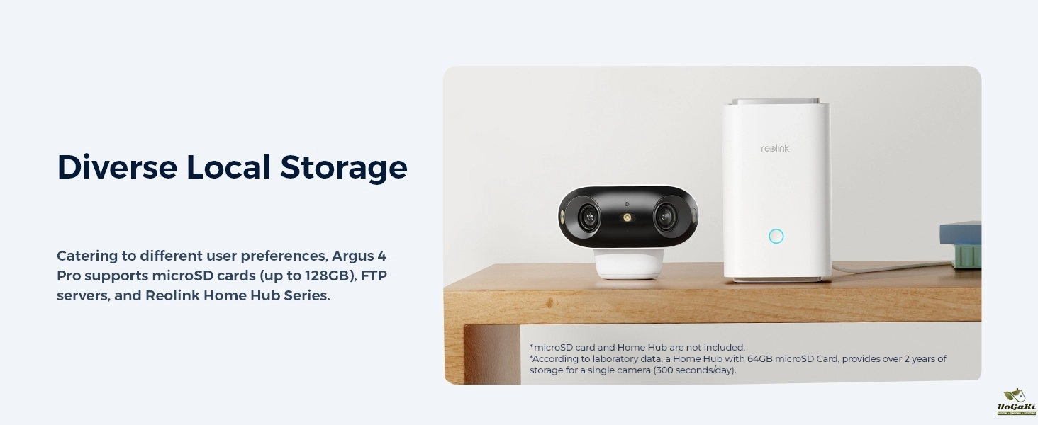 Supports microSD cards (up to 512GB, not included), FTP servers, and Homebase Hub (up to 1TB supported)
