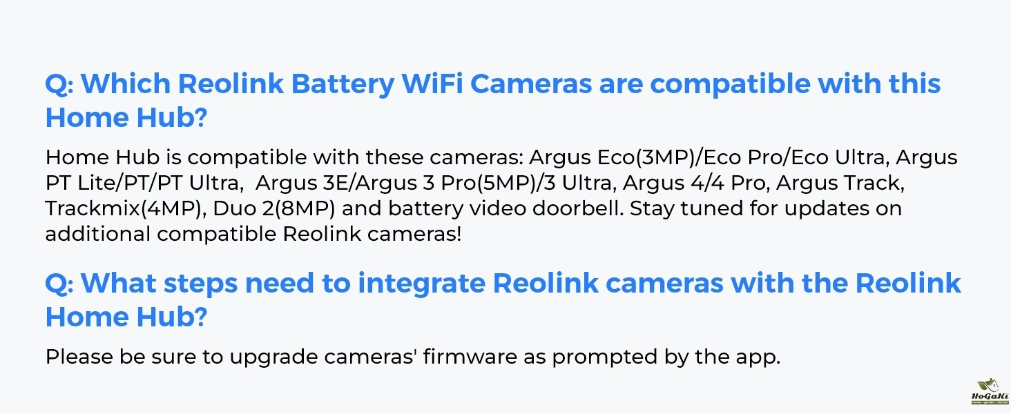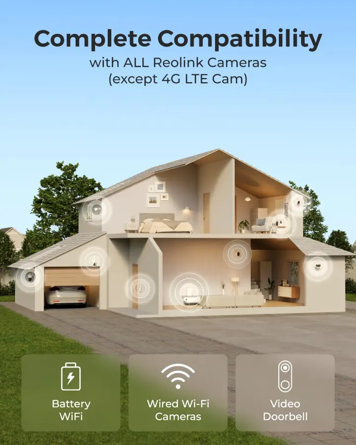 Supports 5/2.4 GHz Dual-Band Wi-Fi & Wi-Fi 6, Reolink Home Series Hub products are currently compatible with all Reolink PoE cameras, Plug-in Wi-Fi cameras, and most recently released battery Wi-Fi cameras except 2MP battery cameras and 4G cameras.