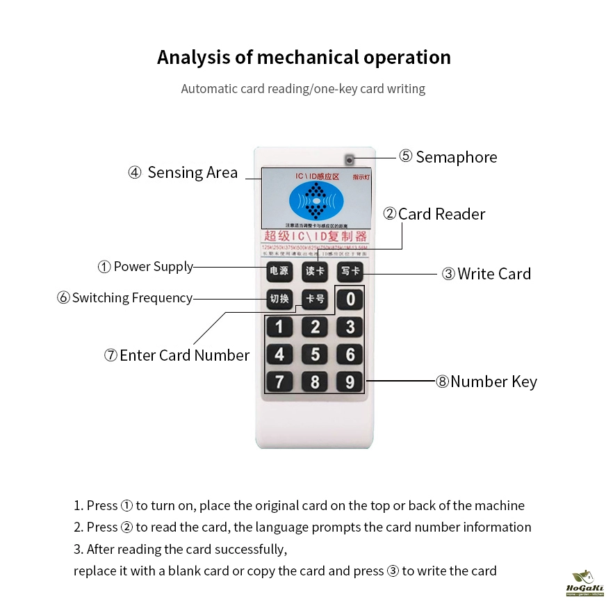 This machine only supports 125Khz, 250Khz, 375Khz, 500Khz, 625Khz,750Khz,875Khz,1M,13.56Mhz (ic mode) reading and copying, encryption card, HID card and card with power supply cannot be read and copied