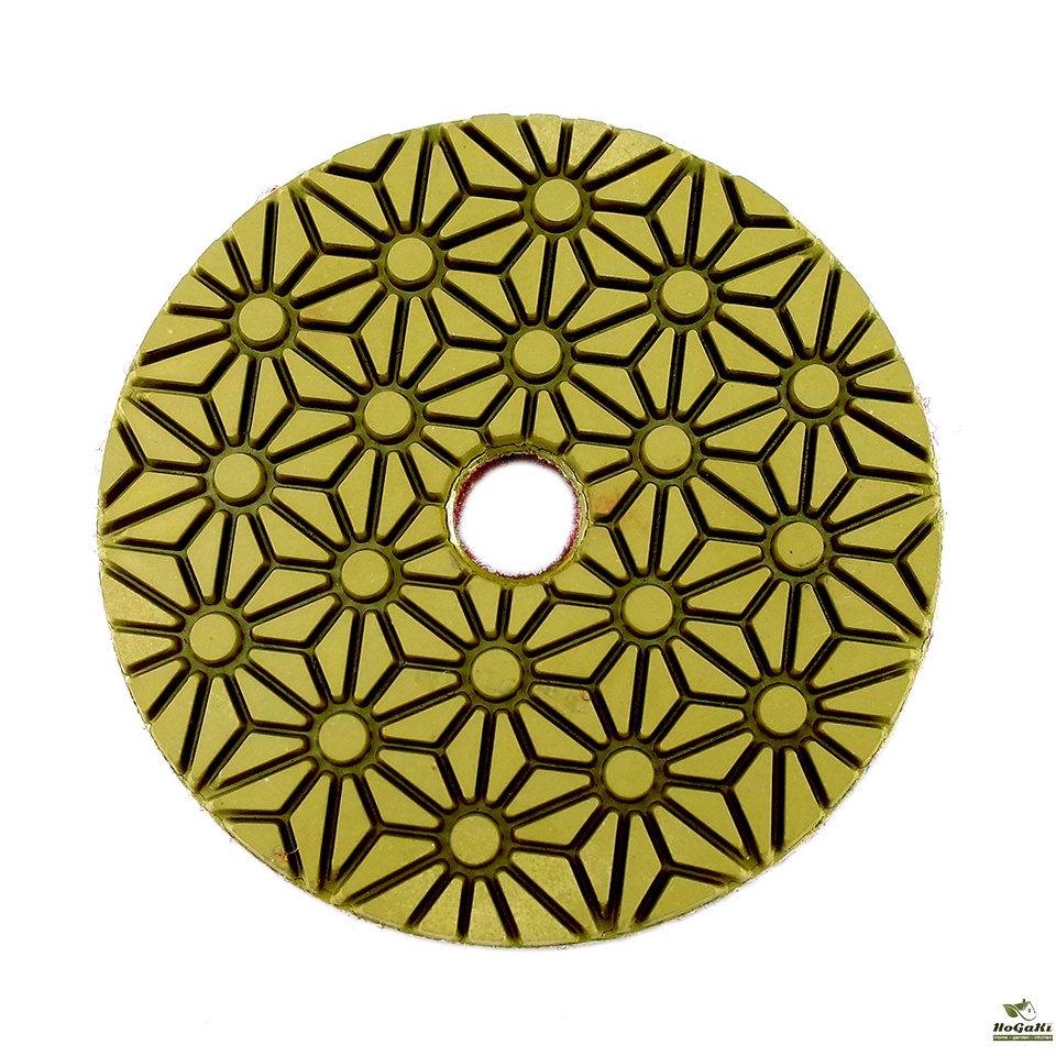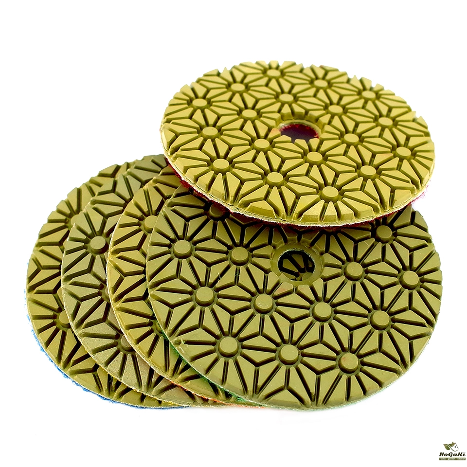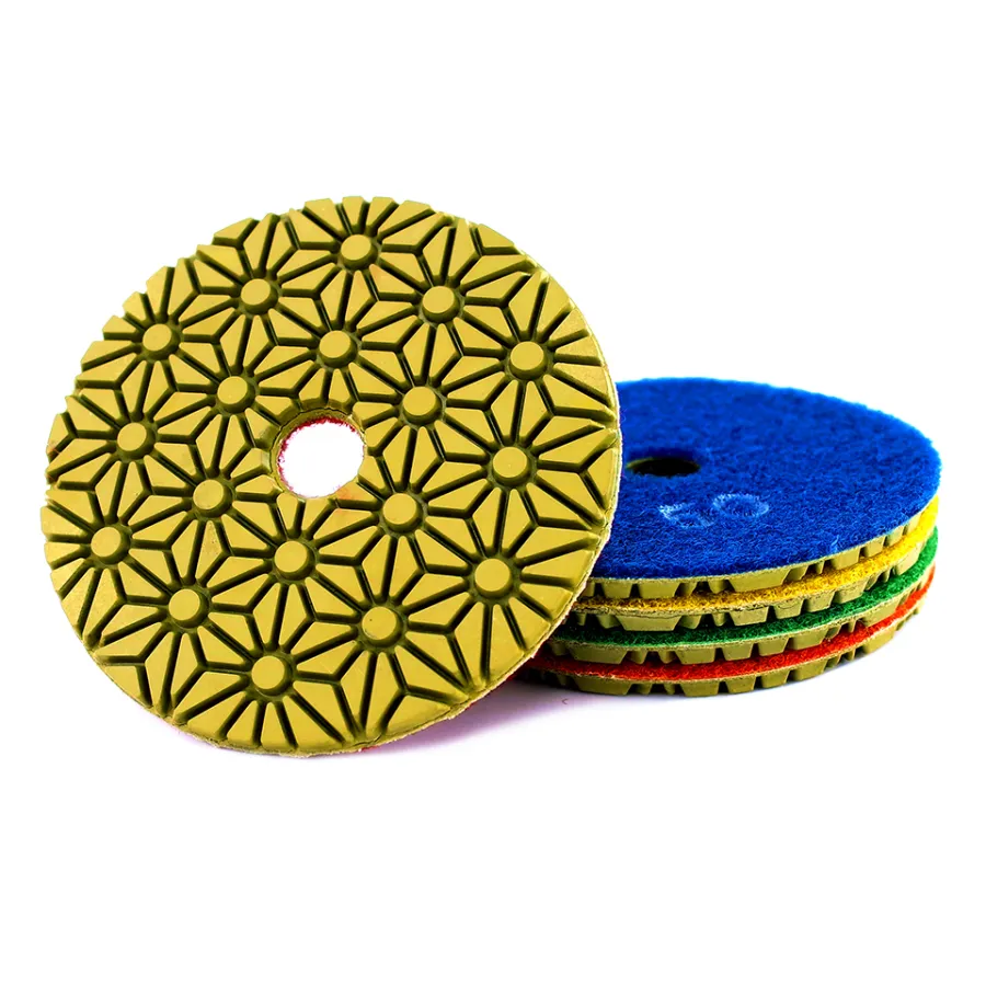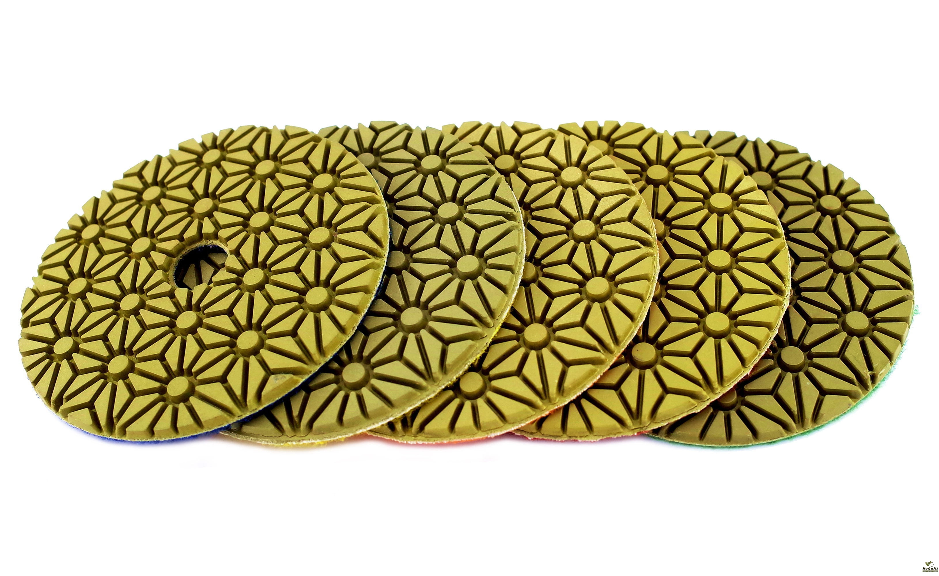This is 5 Steps 4inch flexible resin wet diamond polishing pad for polishing and grinding concrete floor, granite, marble, limestone and all kinds stones, Tiles etc.