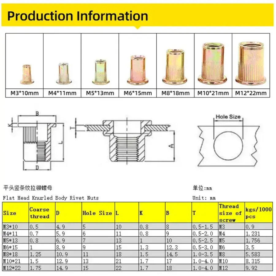 The fastening field of rivet nuts is widely used in the assembly of electromechanical and light industrial products such as automobiles, aviation, instruments, furniture and decoration. It is developed to solve the shortcomings of easy melting of thin metal sheet and thin pipe welding nuts and easy sliding of internal threads. It does not need to tap internal threads, weld nuts, riveting firmly, high efficiency and convenient use.