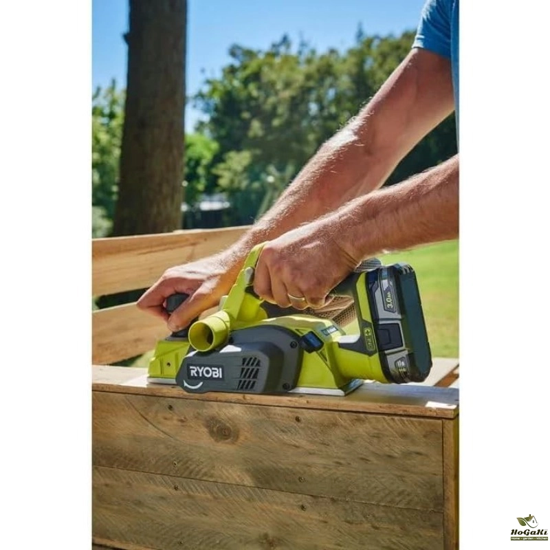 Full size 3-1/4 in. cut width Includes: (2) Reversible Double-Edged Blades and Dust Bag Over 225 ONE+ Tools – All Work With Any RYOBI ONE+ 18V Battery The Ryobi One+ 18-Volt hand planer is the newest member of a family of over 225-tools. It has an incredible 3 in. to1/4 in. cut width and up to 1/16 in. cutting depth per pass. This planer is loaded with great features such as its automatic kickstand, which helps prevent you from marring your work piece and has a convenient on-board blade wrench storage. The dual left or right chip exhaust also gives you the freedom to choose what you are most comfortable with. You can expand your Ryobi One+ tool collection today with this feature packed, cordless 18-Volt planer.