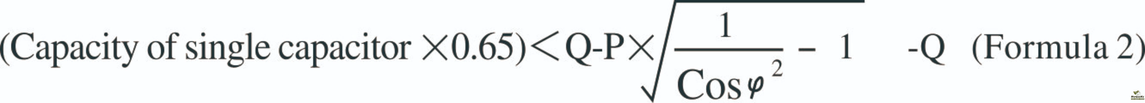 2) When the power factor of electric nerwork is higher than target power factor, and the capacitor bank can't cut automatically, user should consider the following conditions is tenable or not.Use P to indicate the acuive power of electric network, Q to indicate reactive power of present electricc network and cosφ to indicate target power lactorl.Formula 2 must be tenable.