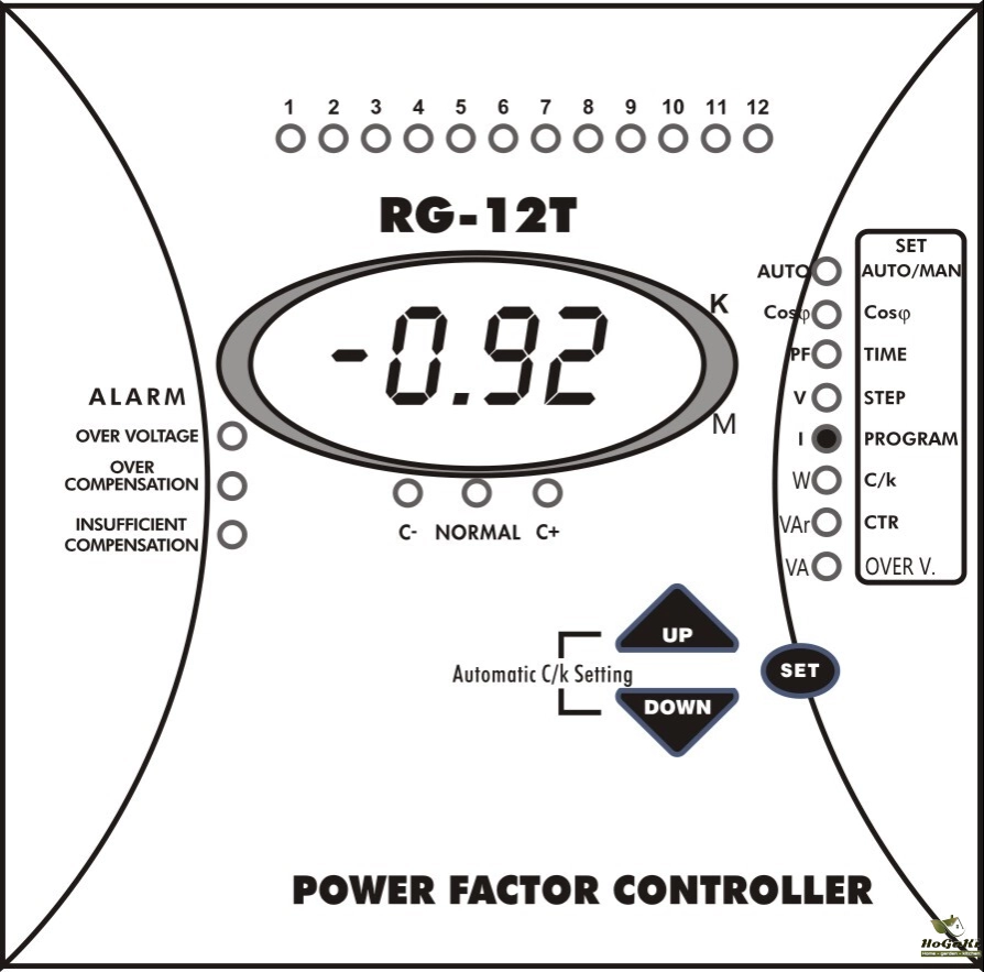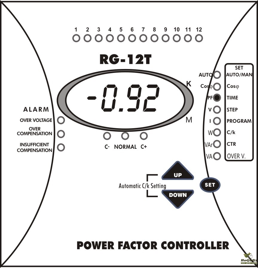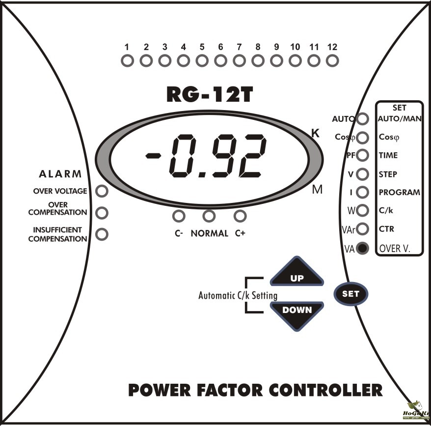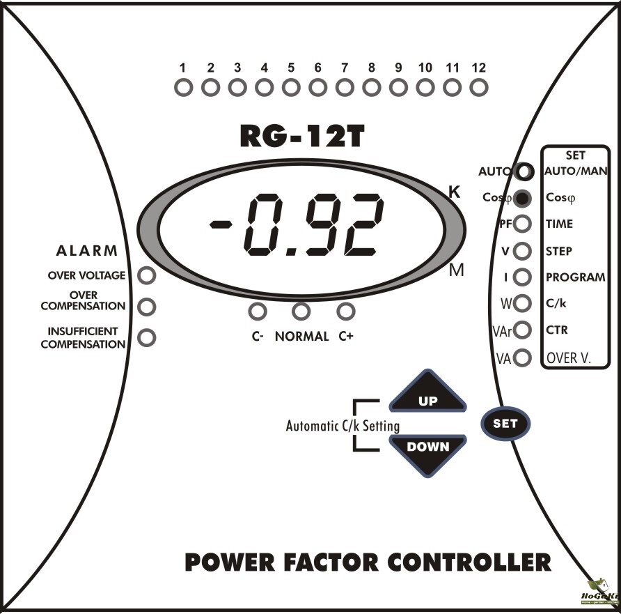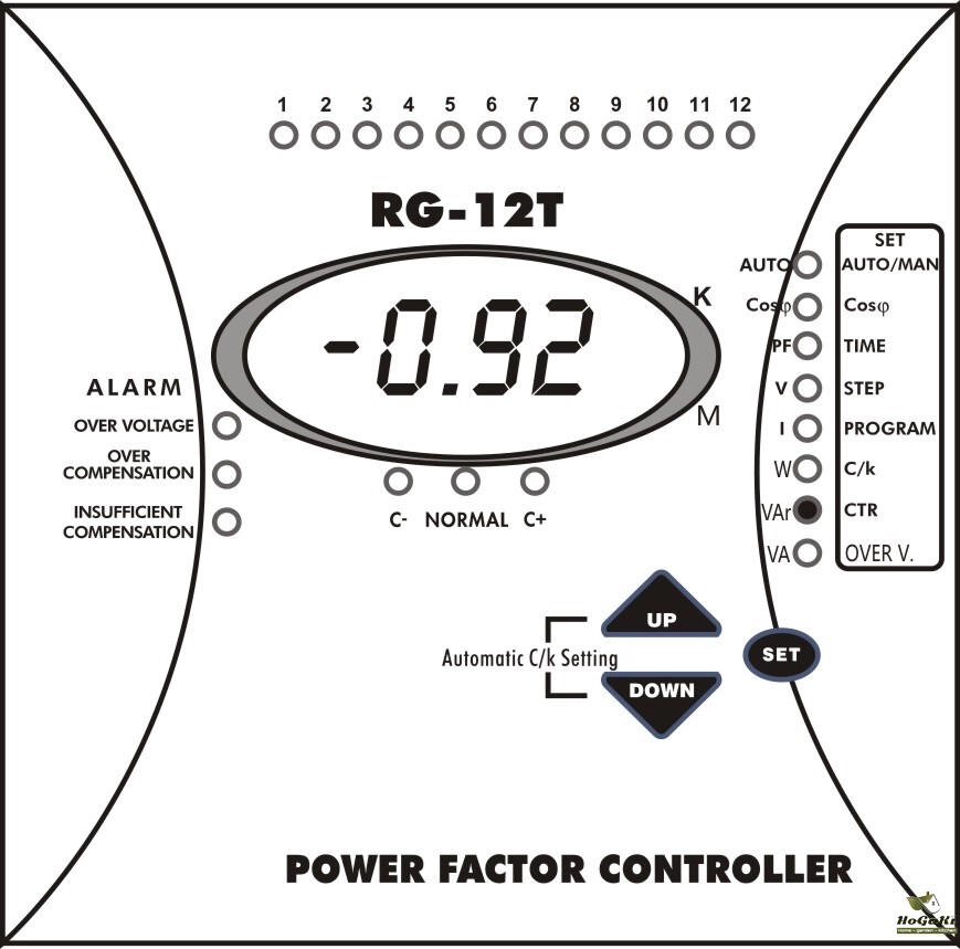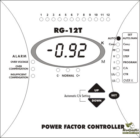 Power Factor Controllers are used for measurement and control of power factor control units for central reactive power compensation. The Power Factor measured by RG-T is compared with the set point values and in order to provide necessary compensation, Power Factor Controller switches capacitor banks ON and OFF automatically. RG-T is a microcontroller relay, designed for above application in 144x144 case for flush mounting with rear plug-in connectors.In addition to displaying the system‘s Cosφ in Automatic Operating Mode, RG-T displays the RMS values of Voltage(V) and Current (I), Active Power (W),Reactive Power (VAr) and Apparent Power (VA) of measuring phase.