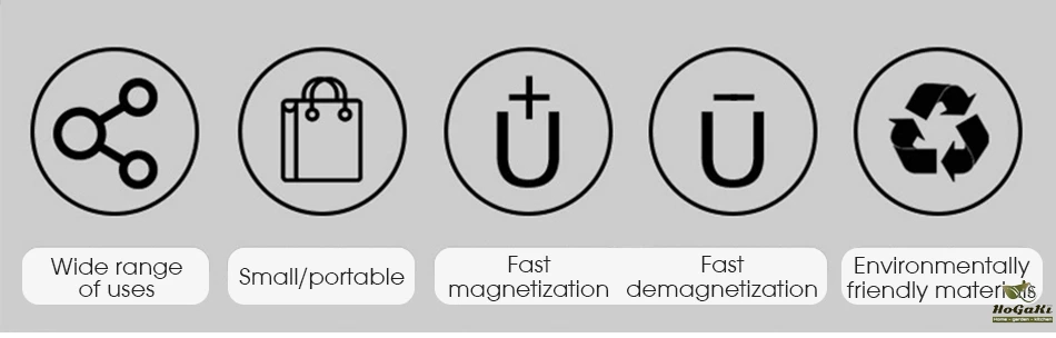 The demagnetizer can quickly convert any tool blade into a magnetic retrieval tool, has a high power to weight ratio, and is contained in a non-fragile plastic.