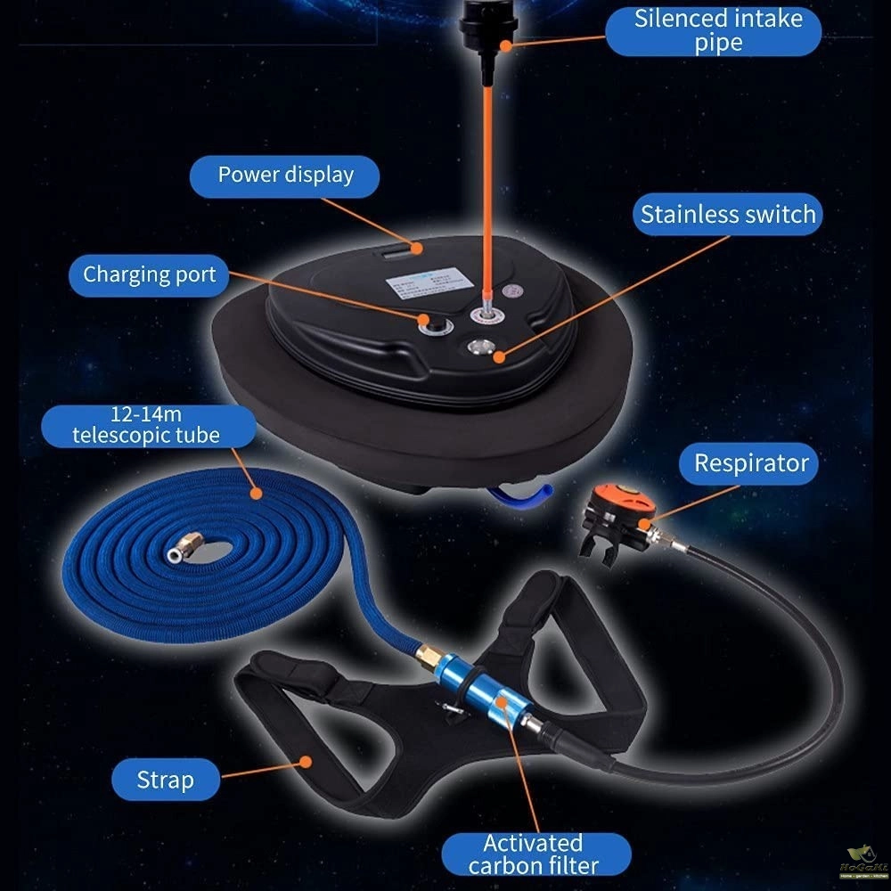 【Upgraded diving equipment system】Newly upgraded diving equipment, lower noise and greater air output. The system is the perfect way for snorkelers to venture beyond the surface. This is a very compact Surface-Suppied-Air dive system that supports one diver to 39.4ft/12m. Whether you are an ocean explorer, poolside parent, treasure hunter, underwater photographer, boat owner, kayaker/paddle boarder, or looking for the latest yacht toys - the diving equipment system is for you.